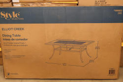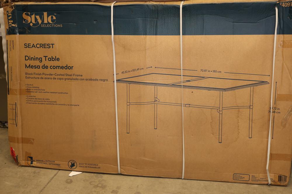 Style Selections Seacrest Dining Table with Black Powder-Coated Steel Frame. Features a durable rust- and weather-resistant design with a tempered glass top. The table measures 42.32 inches wide, 70.87 inches long, and stands 29.72 inches tall. Ships in original box with visible wear. Pickup only.