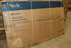 Style Selections Seacrest Dining Table, Powder-Coated Steel Frame. Features a black finish and durable rust- and weather-resistant steel frame. Includes a center hole for an umbrella. Dimensions are approximately 42.32 inches wide by 70.87 inches long by 29.72 inches tall. Item is new in box. Pickup only.