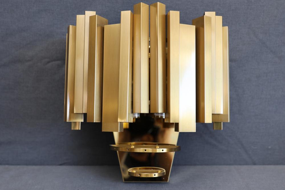 Modern Brass Wall Sconce with Dual Bulb Holders. Constructed with a brass finish and featuring rectangular panel accents. Includes two bulb holders compatible with G9 MAX 40W bulbs (bulbs not included).