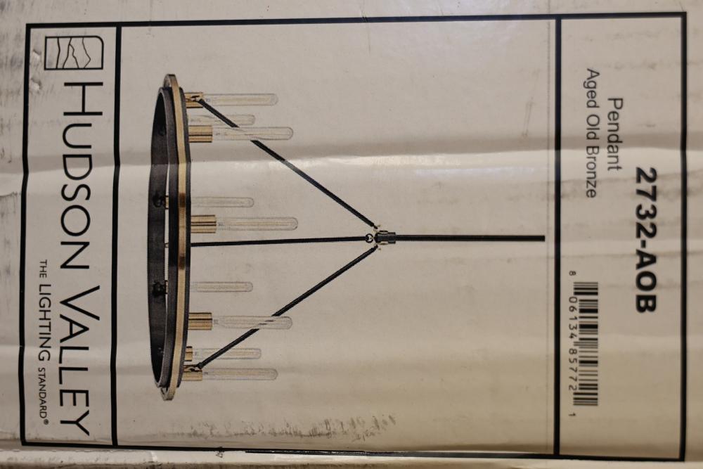 Hudson Valley Lighting Pendant 2732-AOB in Aged Old Bronze. Includes the fixture with multiple light sockets, hanging rods, and mounting components. The item is in its original packaging with protective covering intact. Assembly and installation required. Pickup only.