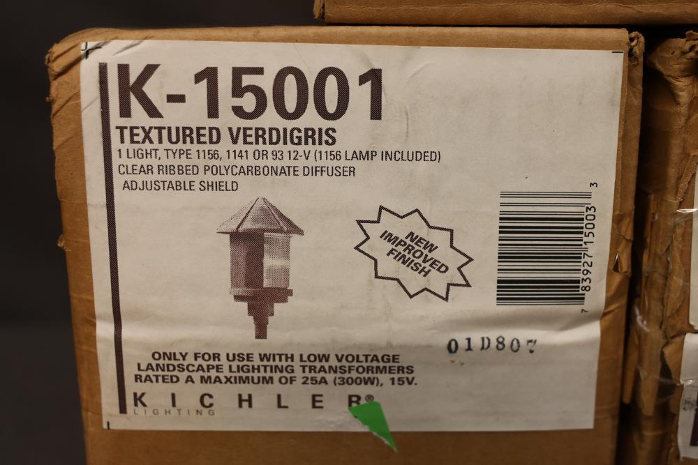 Kichler K-15001 Textured Verdigris Low Voltage Landscape Lights with clear ribbed polycarbonate diffuser and adjustable shield. Includes one Type T155, T164, or T3 12V/11.5W lamp. Each unit is rated for use with low voltage landscape lighting transformers up to 25A (300W), 15V.