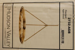 Hudson Valley 2732-AGB Pendant Light in Aged Brass. Includes multiple components such as a circular fixture, rods, and light bases. The pieces are new and unused, with the original packaging intact. Specific installation instructions are provided. Pickup only.