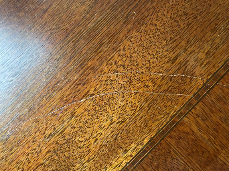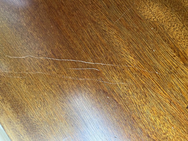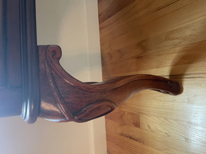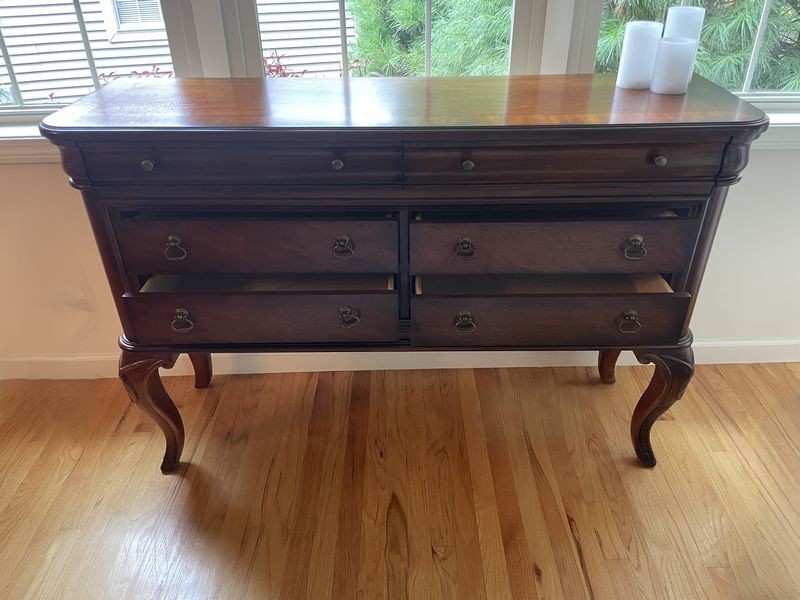 Traditional Wood Sideboard. Dark wood six-drawer sideboard with rounded edges, curved legs, two felt-lined top drawers & four below with metal pulls, 55"Wx17"Dx37"H (visible scratches-see photos).
