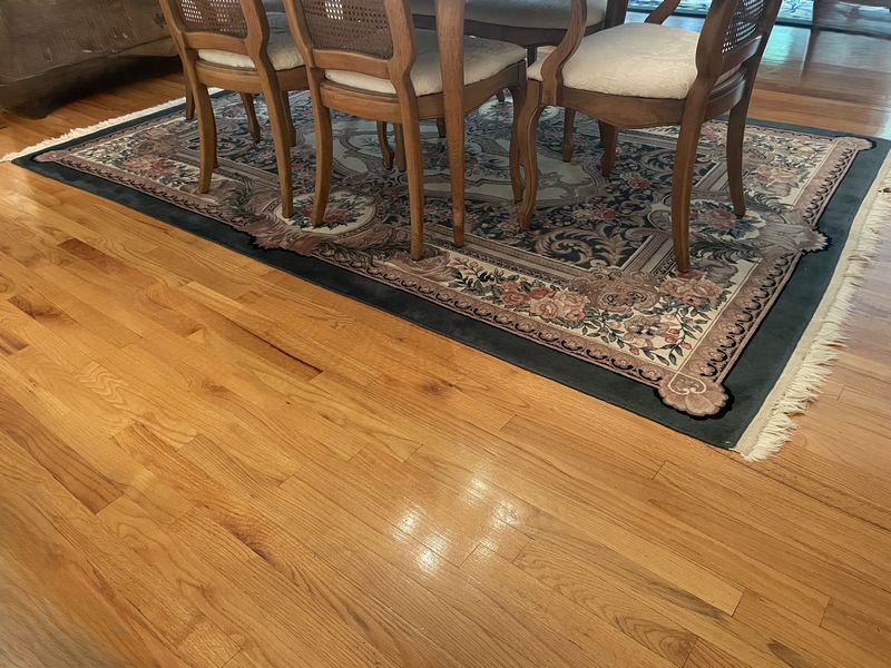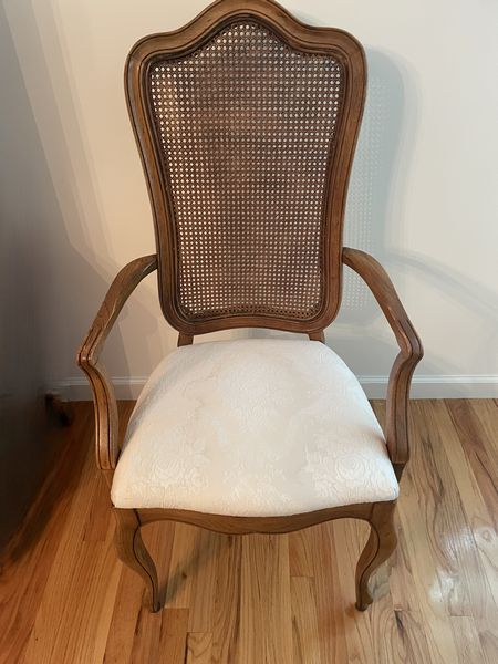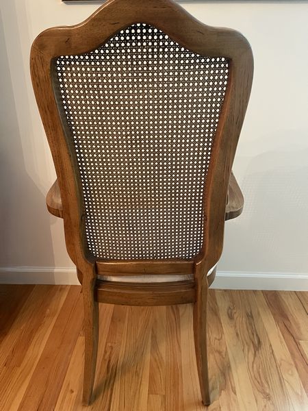 Thomasville Dining Set, Area Rug. Thomasville oval dining table with three 1' table inserts & custom pad, 58"Lx41"Wx30"H; set of six cane back chairs with padded seats (two arm chairs, ea. 21"Wx17"Dx43"H & four side chairs, ea. 18"Wx17"Dx 43"H); area rug approx. 9'x6'. Table & chairs match hutch in Lot #18.