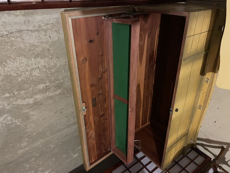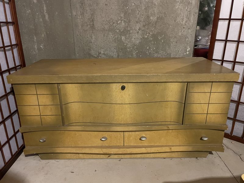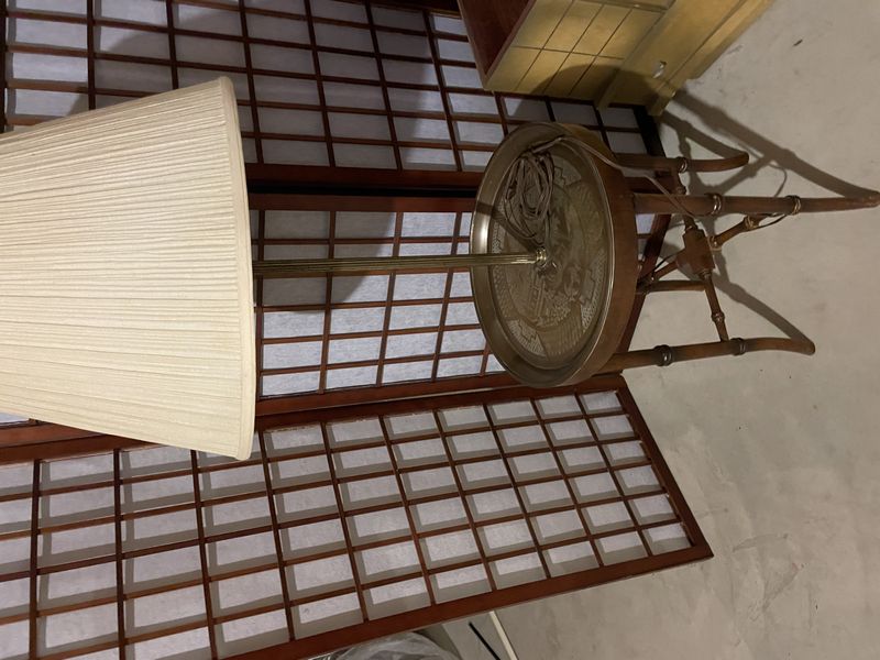 Cedar Chest, Shoji Screens, Tables. Cavalier cedar chest with felt tray & key, 44"Wx17"Dx21"H; brass lamp table, approx. 45"H; pr shoji screens, ea. 70"H; small side table. Located in the basement.