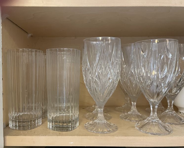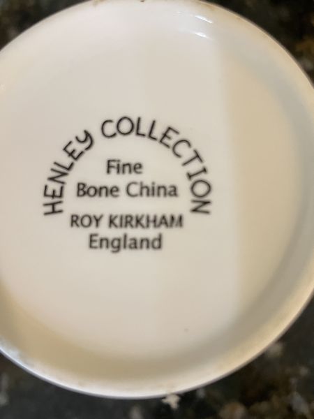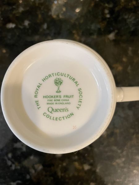 Kitchen Serve Ware/Entertaining. set of four Roy Kirkham England "Henley Collection" mugs; three Royal Horticultural Society "Hookers Fruit" fine bone China cups; set of 12 ea. green glass plates (two sizes); set of 12 Cordon Bleu cup & saucer sets; set of eight crystal glasses. See photos for more details.