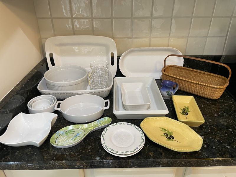 Items include Thomasville glass dining set & front hutch; Shoji screens; modern upholstered Queen Ann winged-back recliner; Corning/Pyrex cook/bake ware; Hampton Bay outdoor dining set; Royal Horticultural Society "Hookers Fruit" fine bone China cups; traditional sideboard; Shaw US made area rug; Romweber US made bar lighted cabinet; wicker chair; Cavalier cedar chest; office furniture & more. Items are located in Niantic, CT.