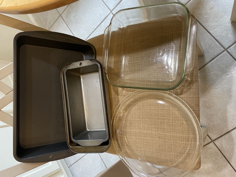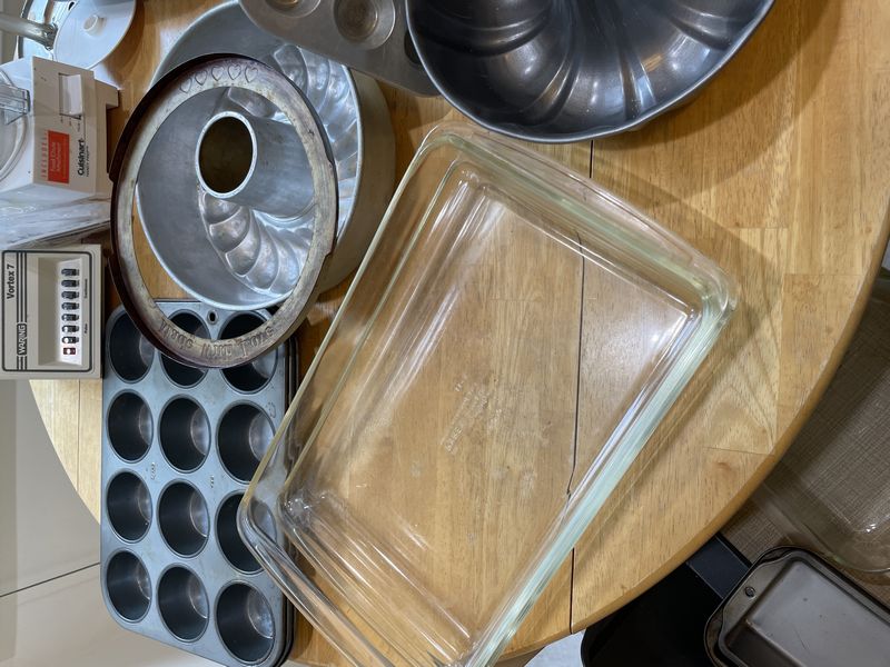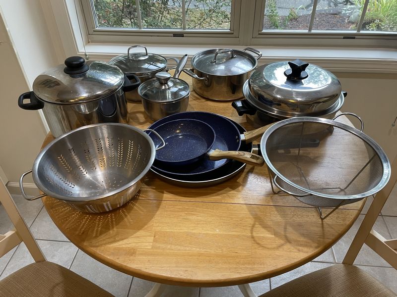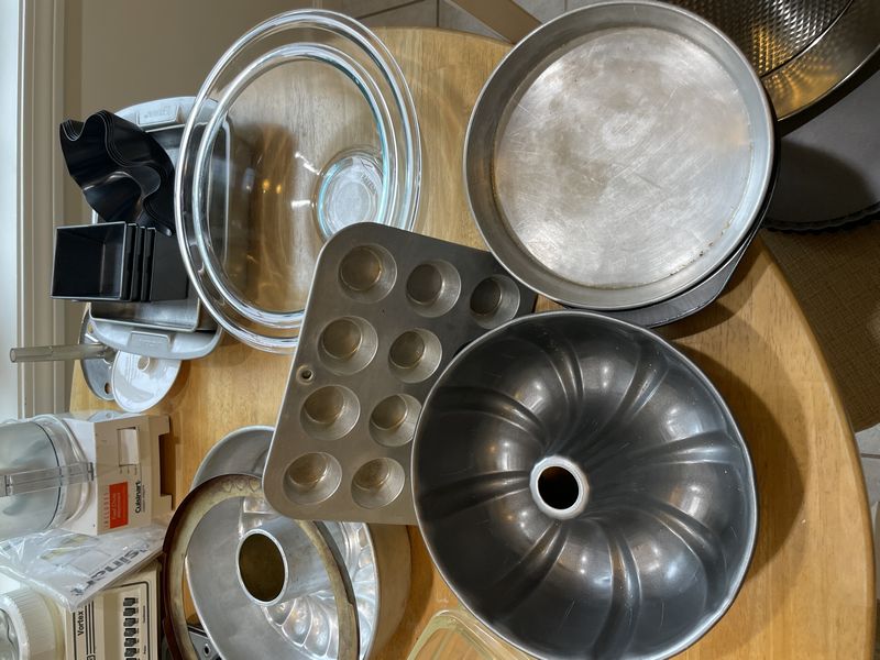 Bakeware and Cookware, featuring Cuisinart, Health Craft. Items inclduing Corning/Pyrex cookware & bakeware; three-cup handy prep food processor; Waring blender; Pyrex cake dish; Health Craft electric cooker; David Burke stainless 1.6QT pot; much more as seen in photos. Table and chairs seen in photos not included.