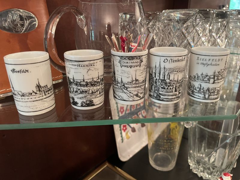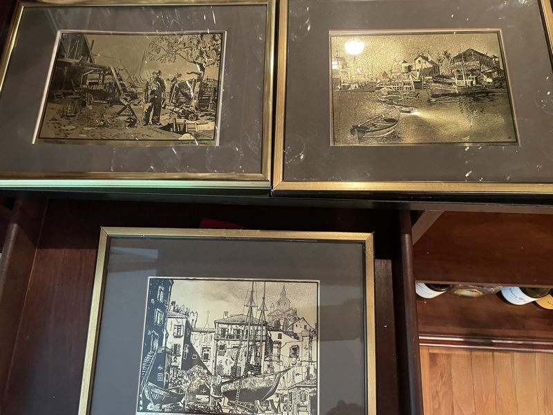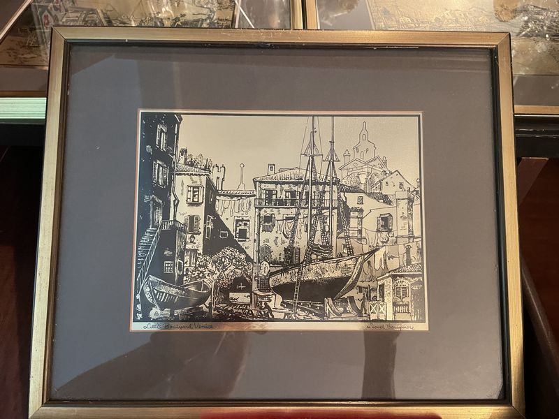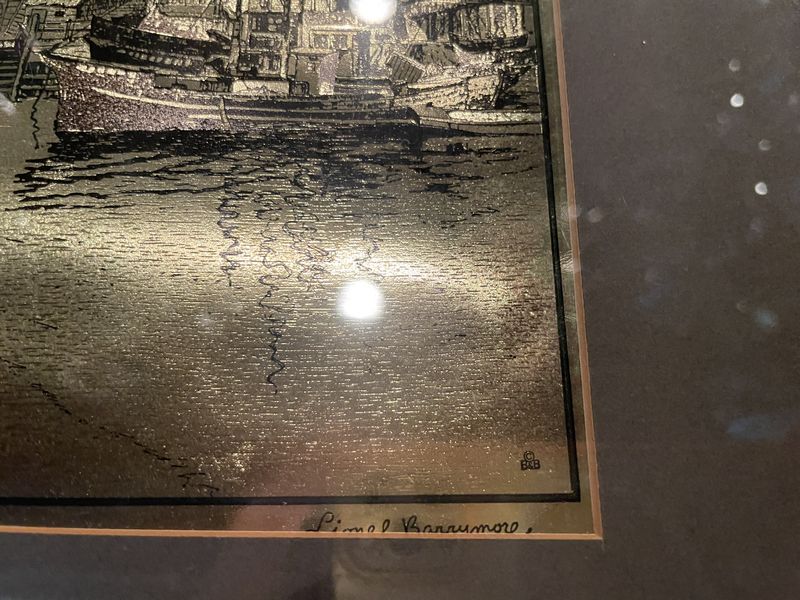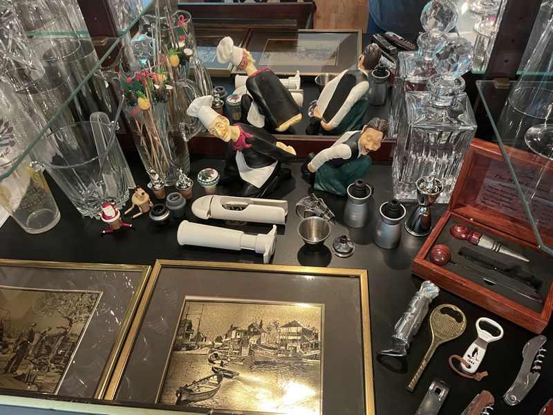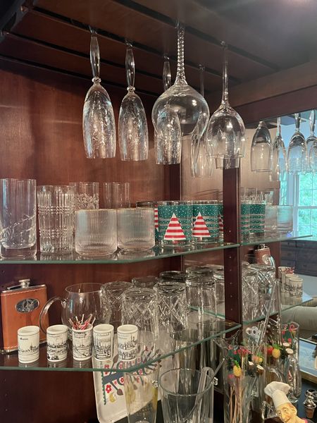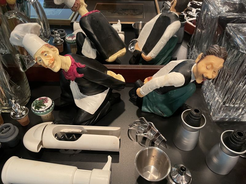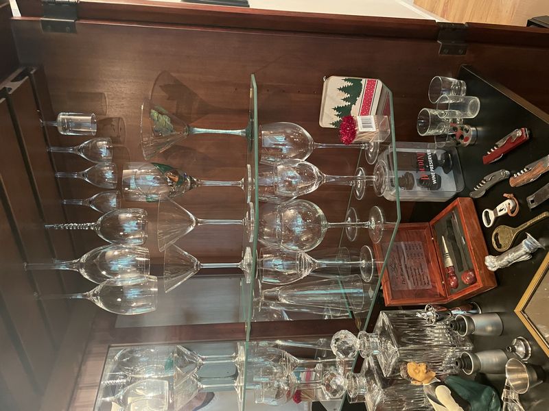Barware, Glasses, Signed Art. assorted glass and crystal incl: wine, martini, highball, shot glasses; crystal wine decanter; whimsical wine bottle holders; wine stoppers; corkscrews; etched pictures signed by American actor Lionel Barrymore; much more! See photo for more details. Cabinet seen in photos incl in lot #7.