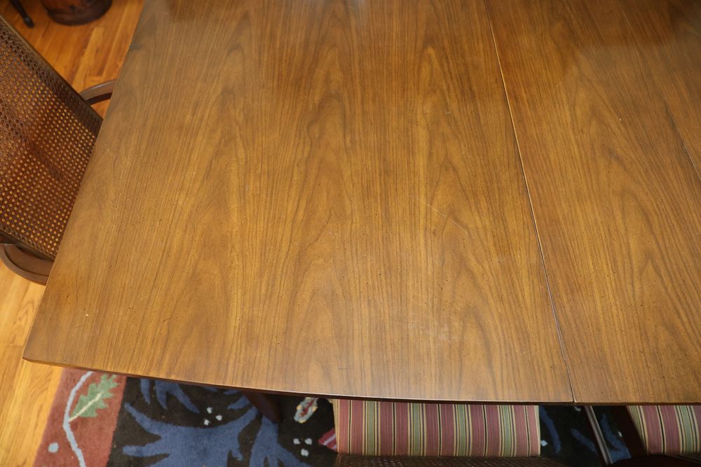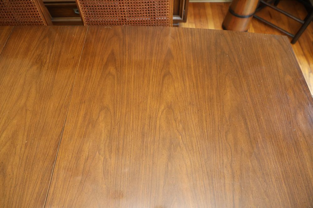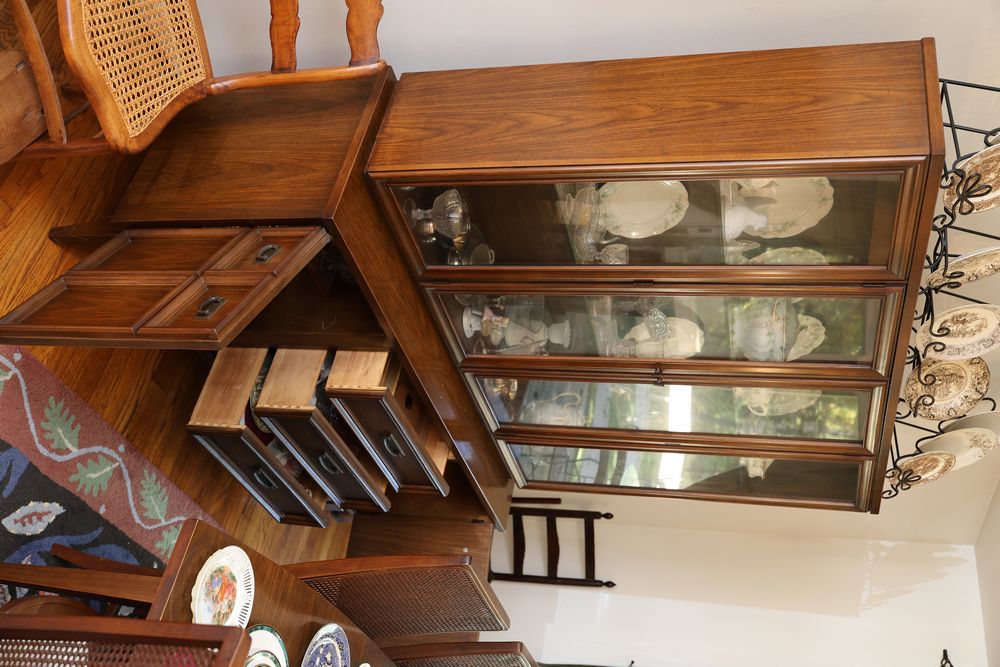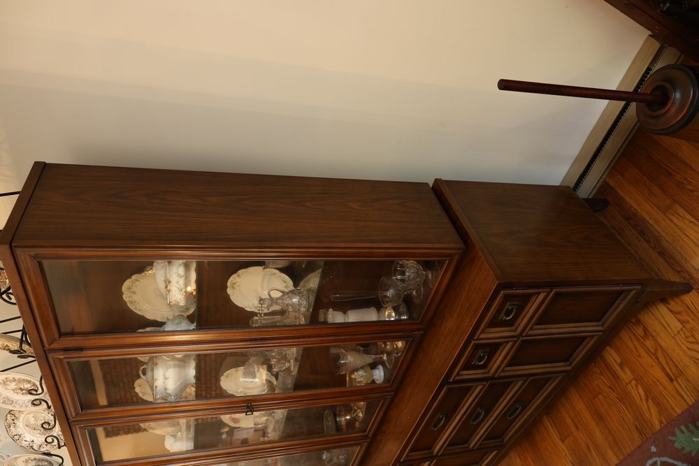 Dining Table With 3 Leafs and Hutch With Glass Shelves and Lighting. The table measures 74.25"W x 40"D x 29"H and includes 3 leafs, each approximately 12". The hutch measures 62"W x 19"D x 77"H and is divided into two pieces. The top piece is 46.5"H, features glass shelves and lighting, and is wooden. Does not include items from other lots. Buyer is responsible for all materials and help necessary for safe and proper removal. Buyer must take all. Pickup only.