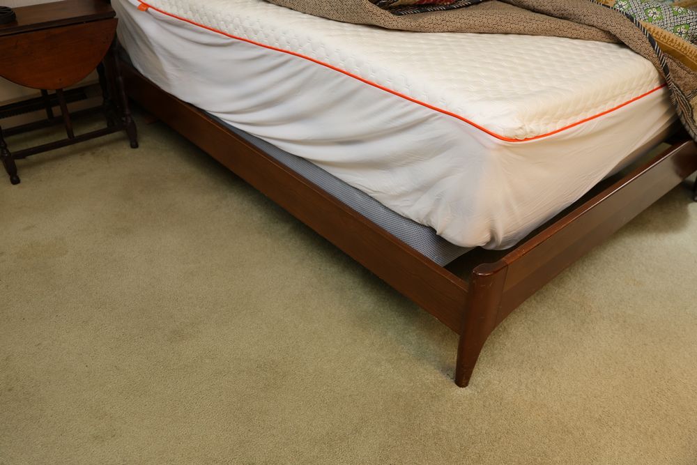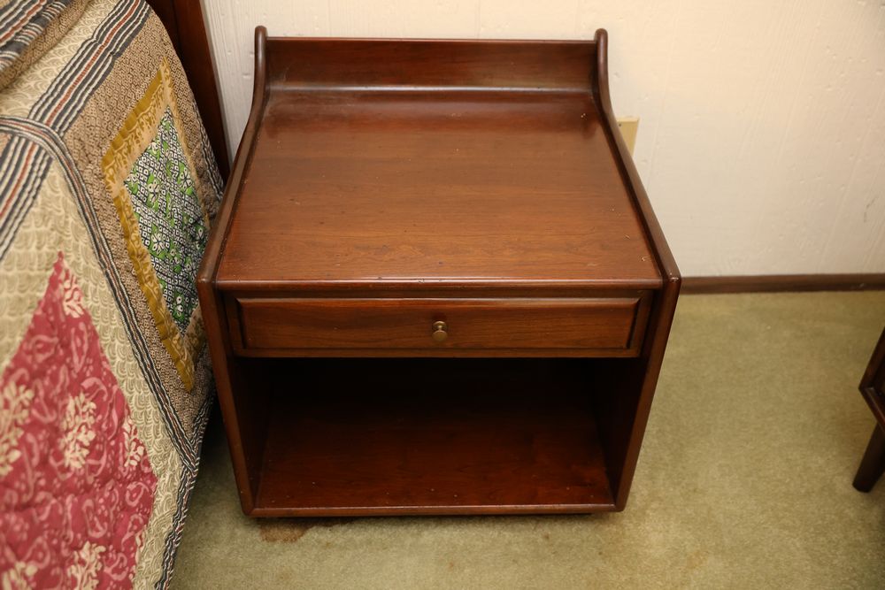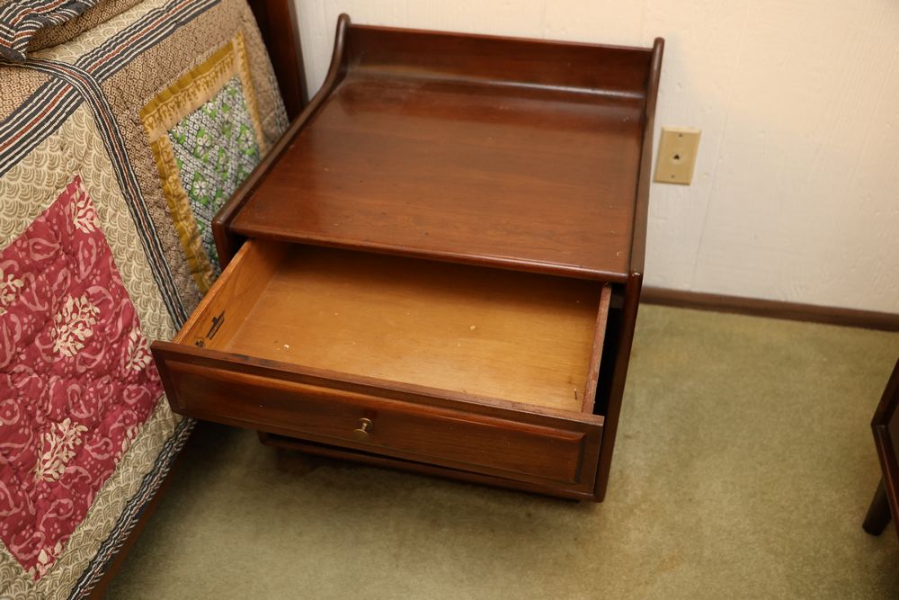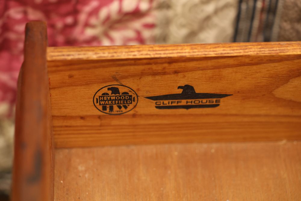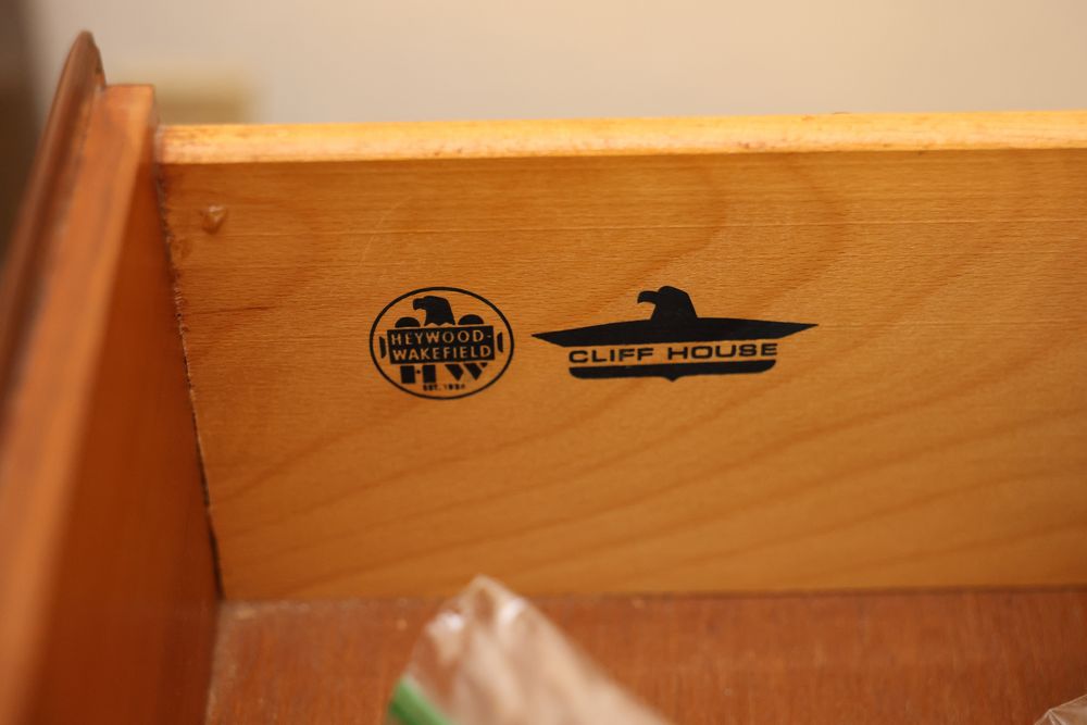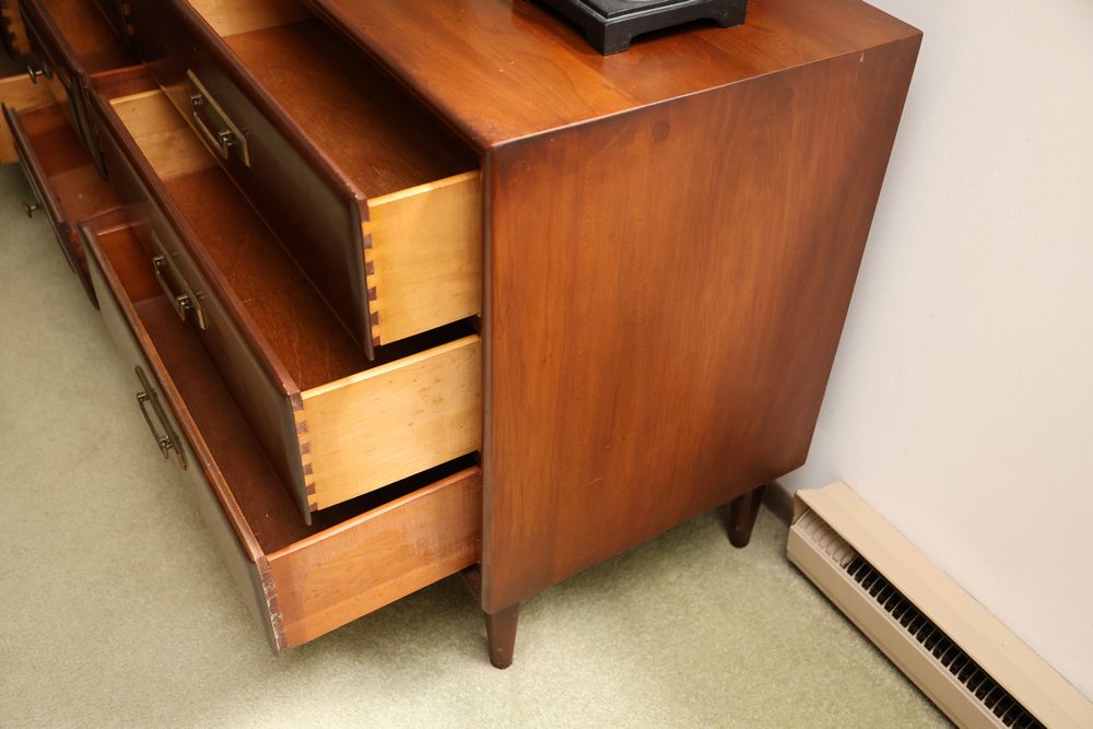 Heywood-Wakefield bedroom set featuring a Mid-Century Modern style. The set includes a 72"W x 18"D x 29.5"H dresser, an additional end table, and a 55.5"W x 36"H headboard. Maker's mark visible in the drawers of the dresser. Features additional bedroom furniture. Excludes wooden trunk and ceramic items on top of dresser. Buyer is responsible for all materials and help necessary for safe and proper removal. Buyer must take all. Pickup only.