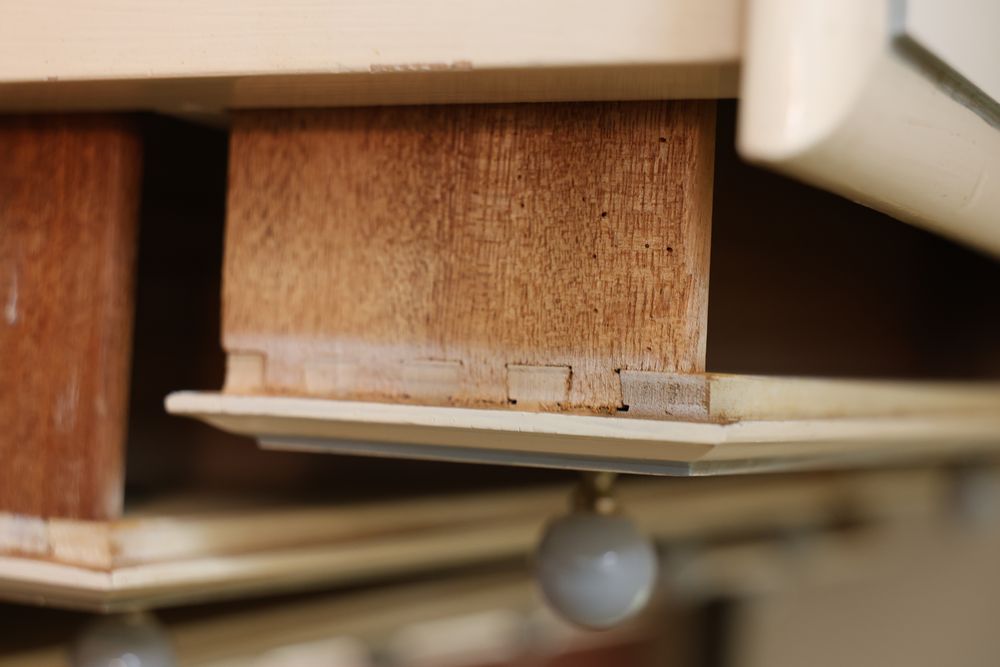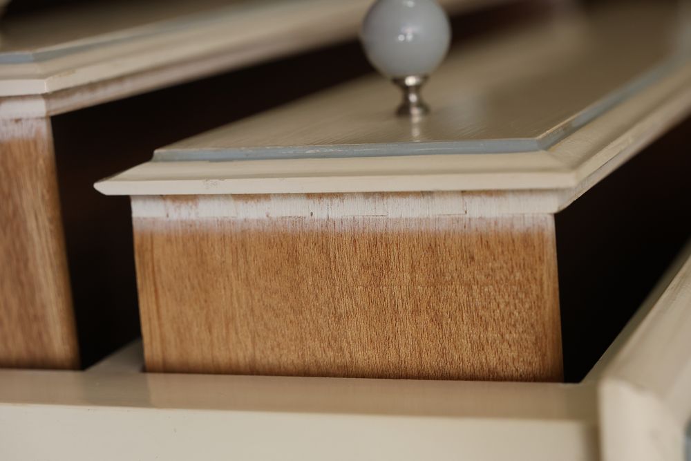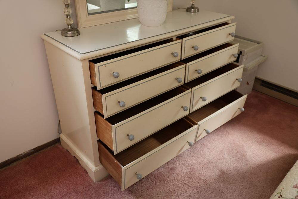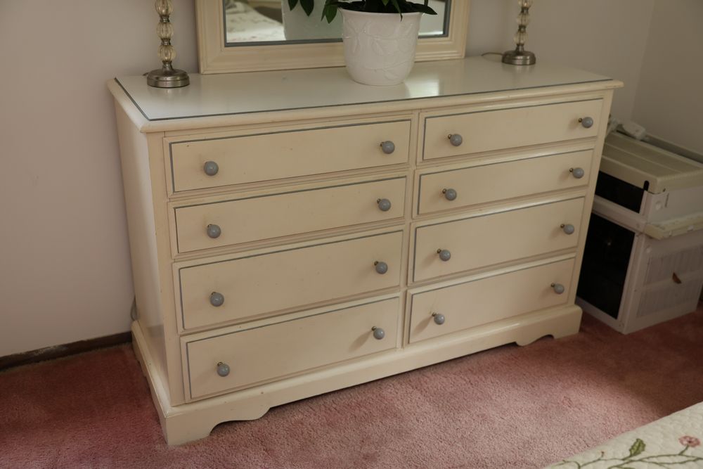 Traditional Bedroom Furniture Set With Dresser, Chest, Mirror, and Nightstand. Includes a cream-finished dresser with eight drawers 52"W x 18"D x 32"H, a matching chest of drawers 34"W x 18"D x 44.5"H, a wall mirror 41"H x 21"W, and a single-drawer nightstand. Furniture features simple detailing, wooden construction, and coordinating knobs. Does not include bedframe or mattress. Buyer is responsible for all materials and help necessary for safe and proper removal. Buyer must take all. Pickup only.