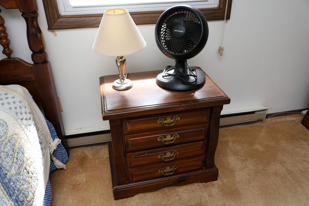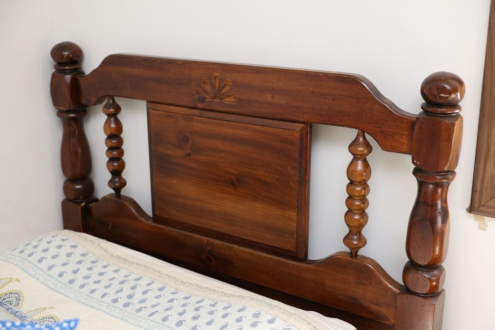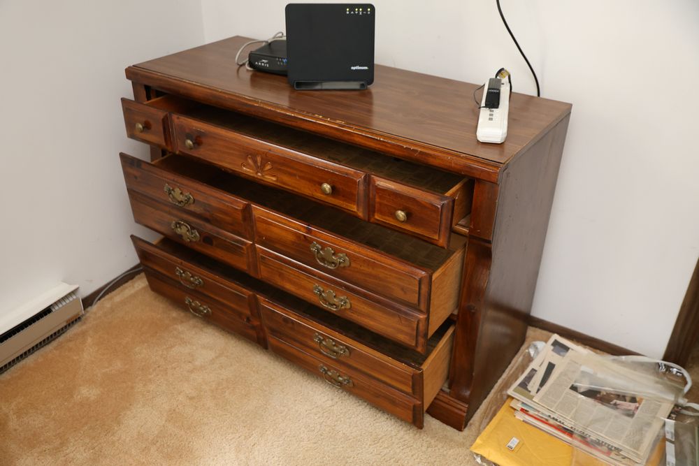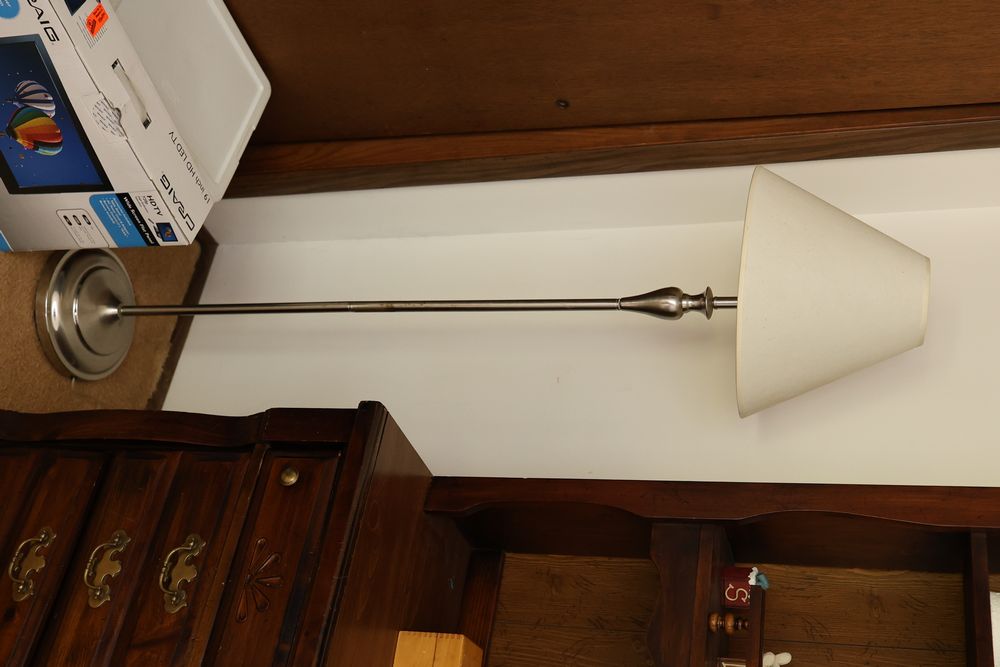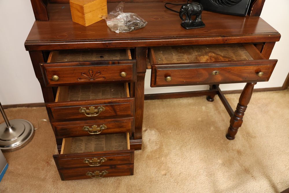 Wooden Furniture Set with Key Collection and Floor Lamp. Includes a twin-sized headboard and twin frame with spindle design, a matching bedside table with three drawers, a chest of drawers featuring multiple compartments 44"W x 18"D, a desk with detachable hutch showcasing shelves and drawers 44"W x 17.5"D x 75"H, a wooden chair, and a metal floor lamp with a white fabric shade. Does not include items from other lots. Buyer is responsible for all materials and help necessary for safe and proper removal. Pickup only.