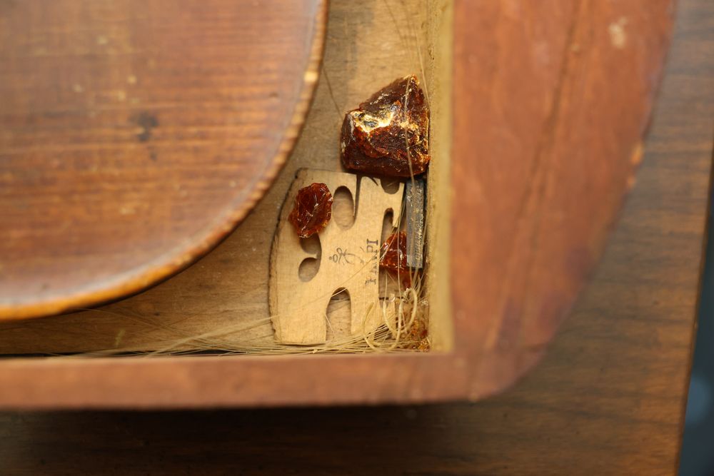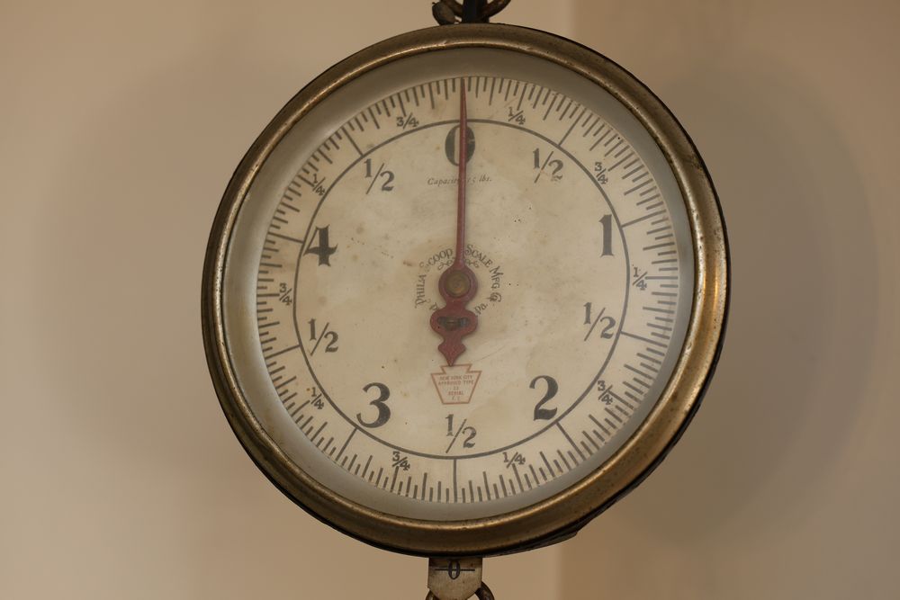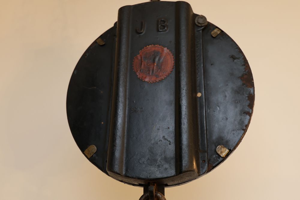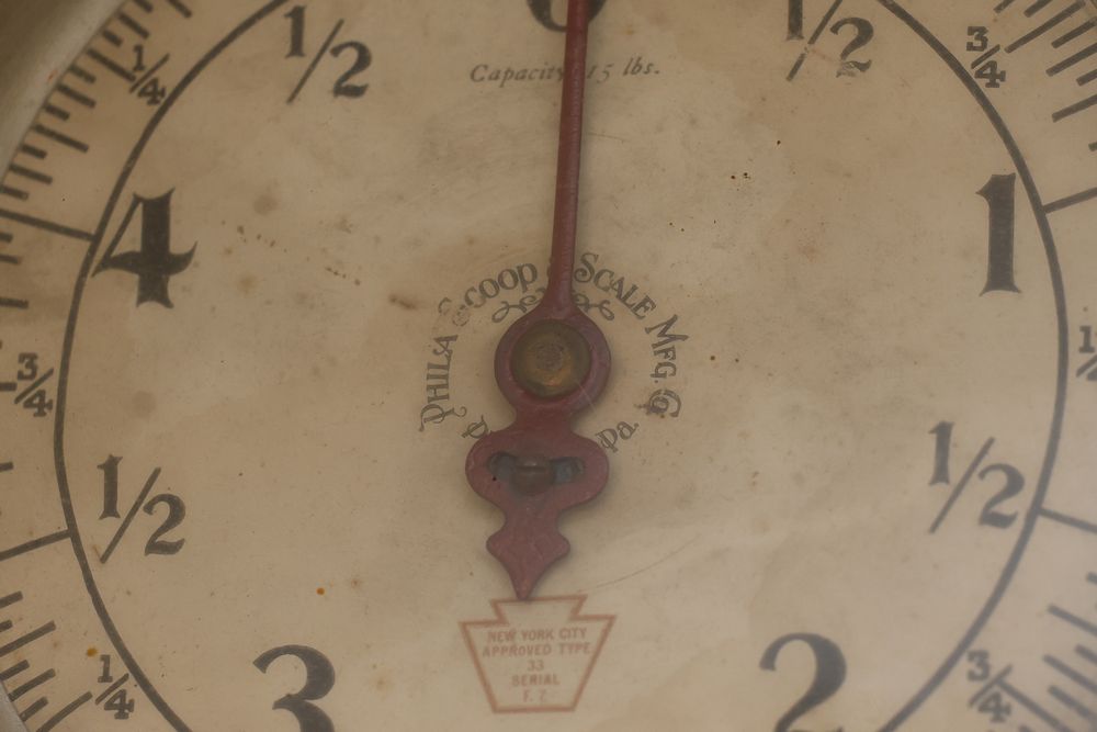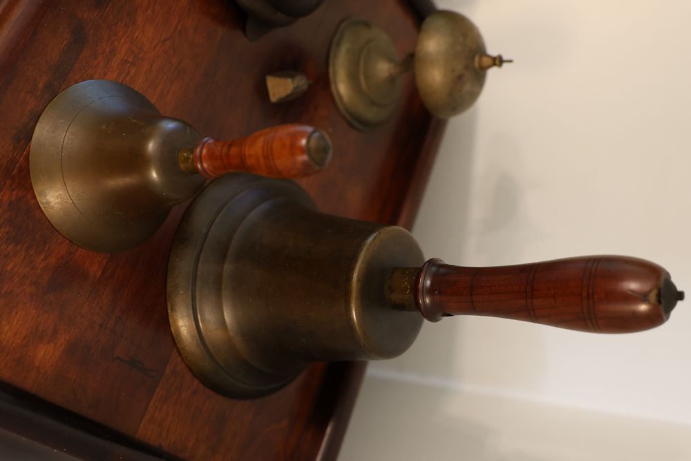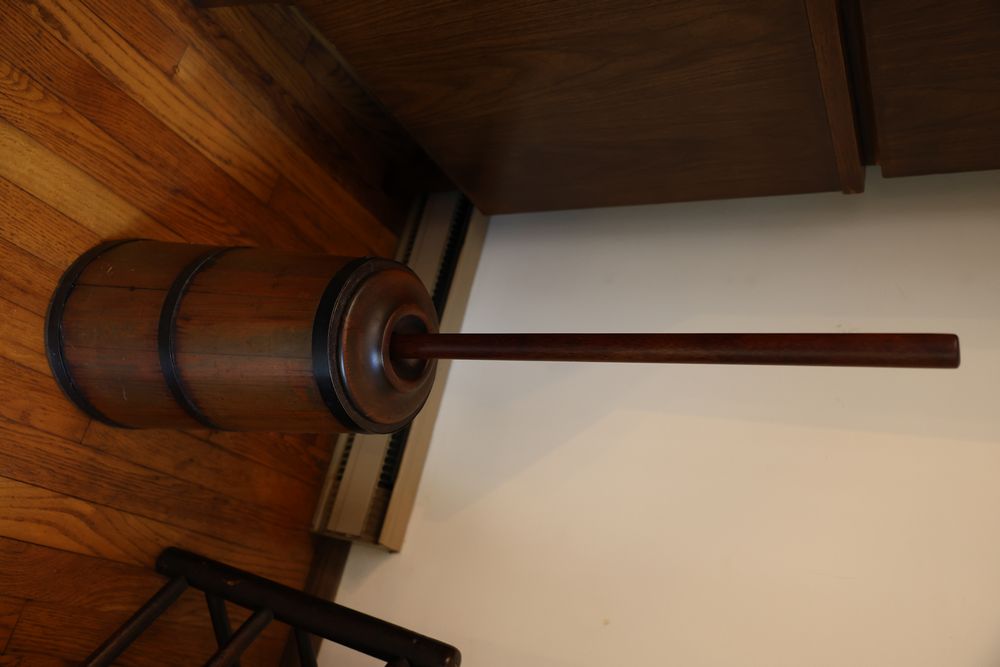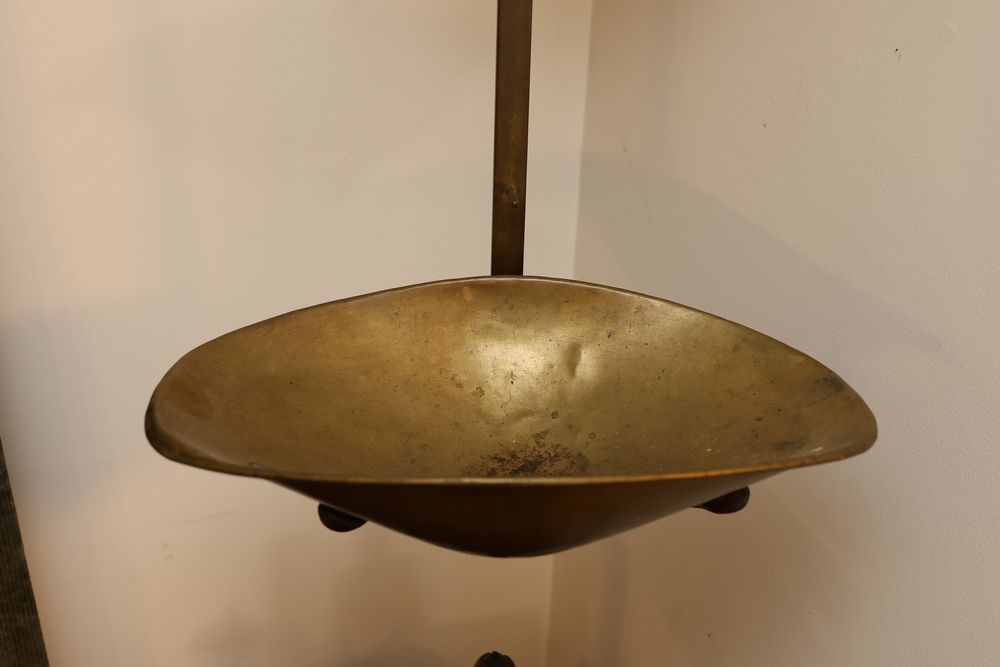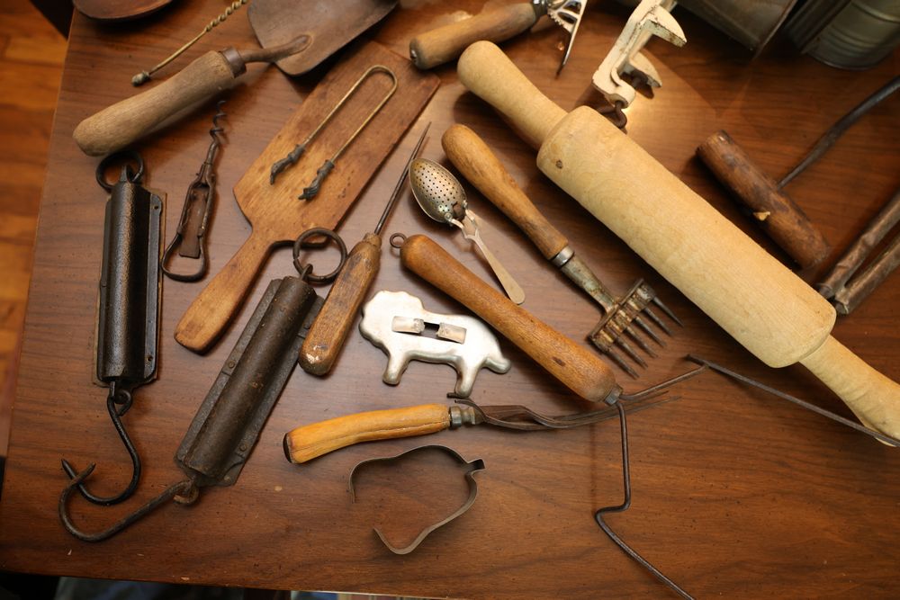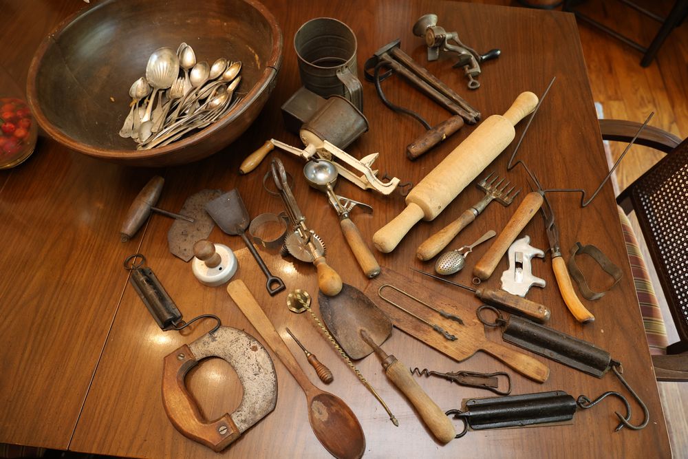 Vintage Metalware, Kitchen Utensils, Brass Scale, and Instrument. Includes brass weighing scale with a capacity of 30 lbs., featuring a hanging pan and ornate red needle. Bells with turned wooden handles, kitchenware including rolling pin, corer, scoops, and ladles, and a rustic violin in a worn wooden case. The lot also includes silverware utensils and a large wooden bowl. Buyer must take all. Pickup only.