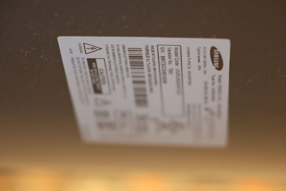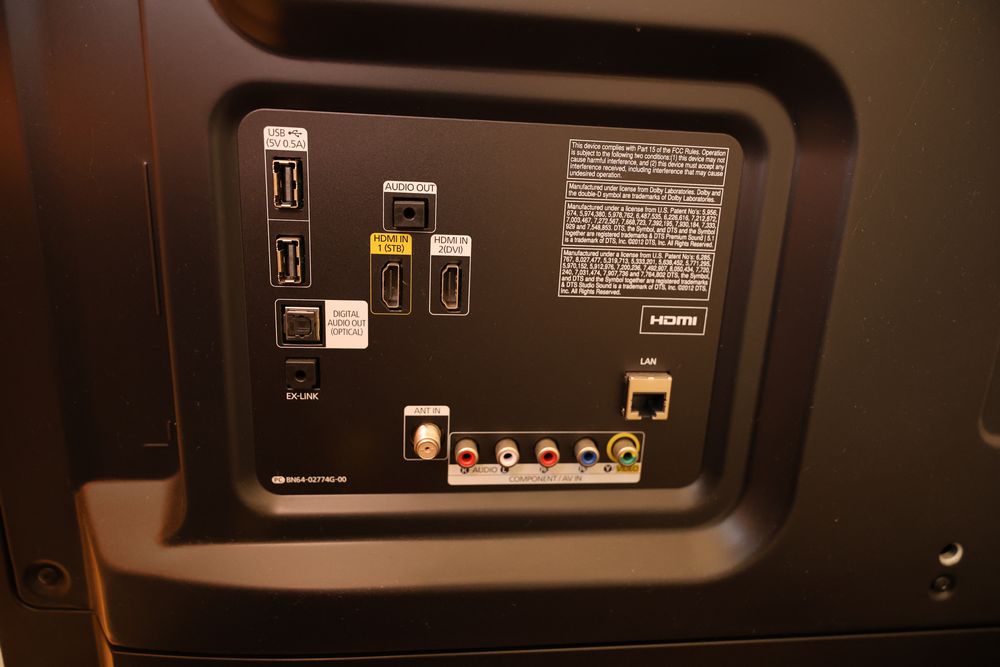 Samsung 55-Inch LED HDTV With HDMI and USB Ports. The television features multiple HDMI and USB ports, as well as component and LAN input options. Includes a sturdy stand and offers Full HD picture quality. Power specifications and model details can be found on the back panel. Pickup only.