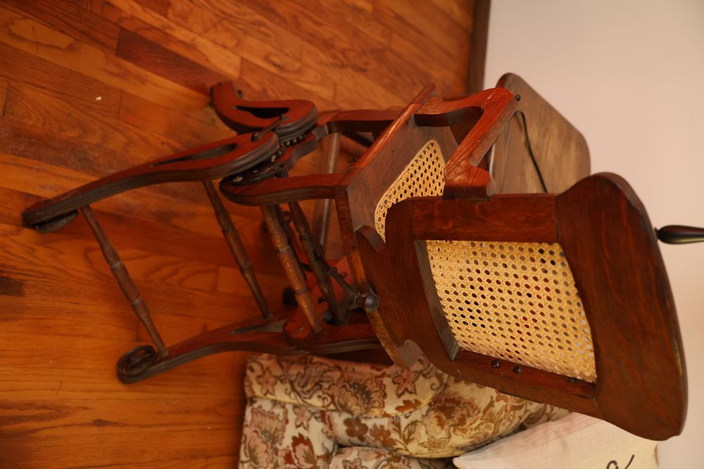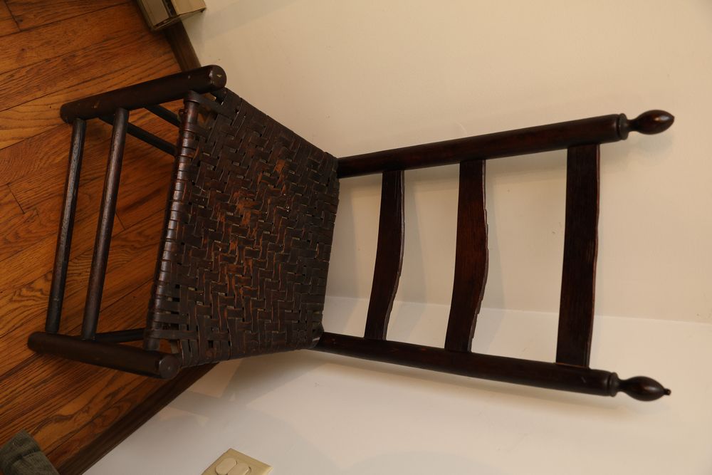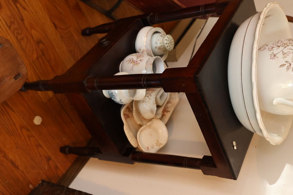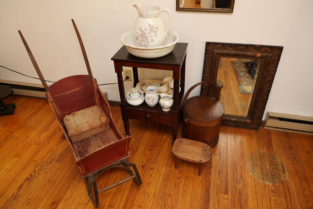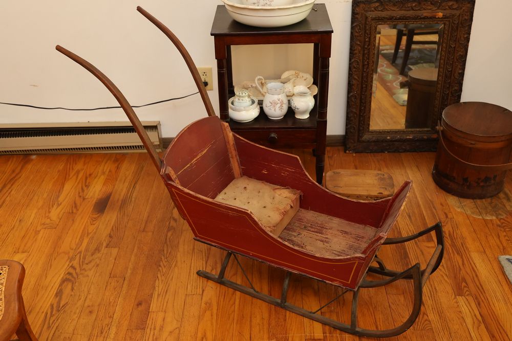 Furniture and Decorative Items Including Chairs, Desk, Rocking Sleigh, and Table. Includes a child's red wooden rocking sleigh with handlebars and iron runners, a wooden side desk with two drawers and a cabinet accented with brass hardware, a wooden storage box with hinged lid, a decorative lamp with lace-patterned shade, multiple wooden chairs with wicker or woven seats, a dark wooden table with carved design, and a washstand with accompanying ceramic pitcher and basin. Does not include items from other lots or contents within furniture. Buyer is responsible for all materials and help necessary for safe and proper removal. Buyer must take all. Pickup only.