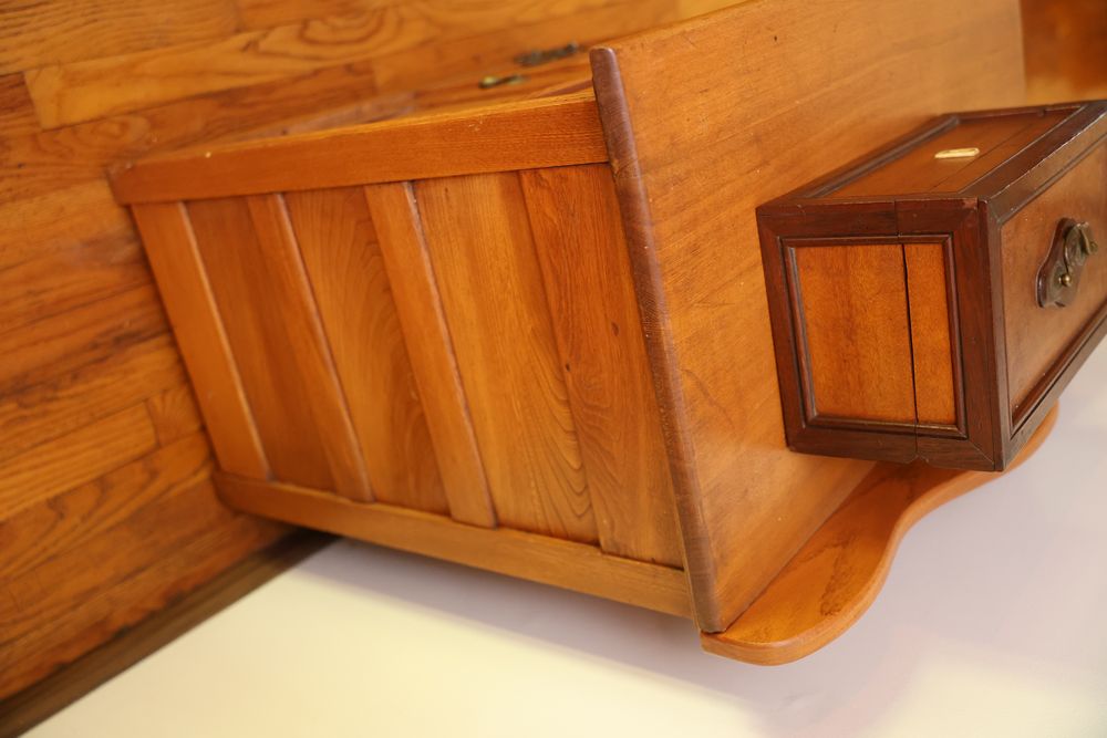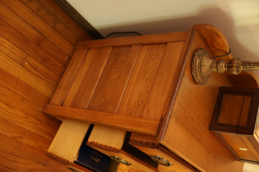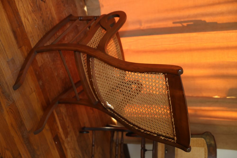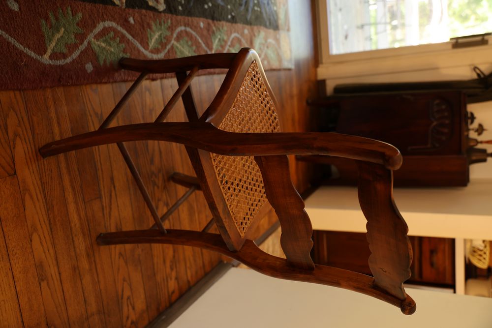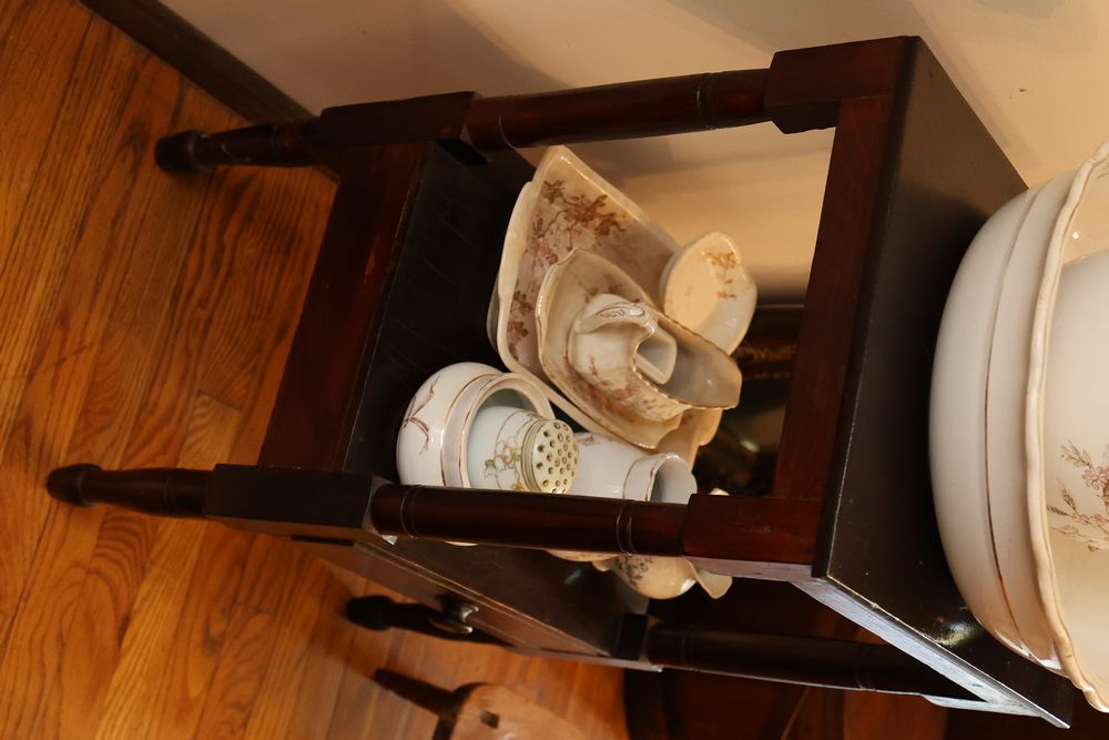 Furniture and Decorative Items Including Chairs, Desk, Rocking Sleigh, and Table. Includes a child's red wooden rocking sleigh with handlebars and iron runners, a wooden side desk with two drawers and a cabinet accented with brass hardware, a wooden storage box with hinged lid, a decorative lamp with lace-patterned shade, multiple wooden chairs with wicker or woven seats, a dark wooden table with carved design, and a washstand with accompanying ceramic pitcher and basin. Does not include items from other lots or contents within furniture. Buyer is responsible for all materials and help necessary for safe and proper removal. Buyer must take all. Pickup only.