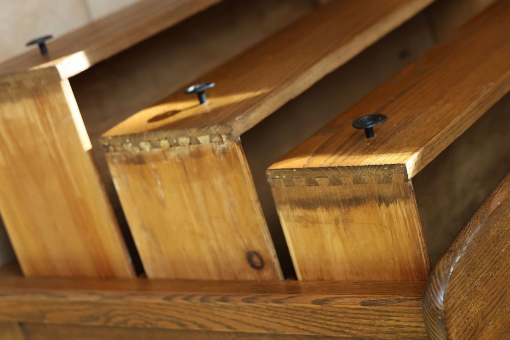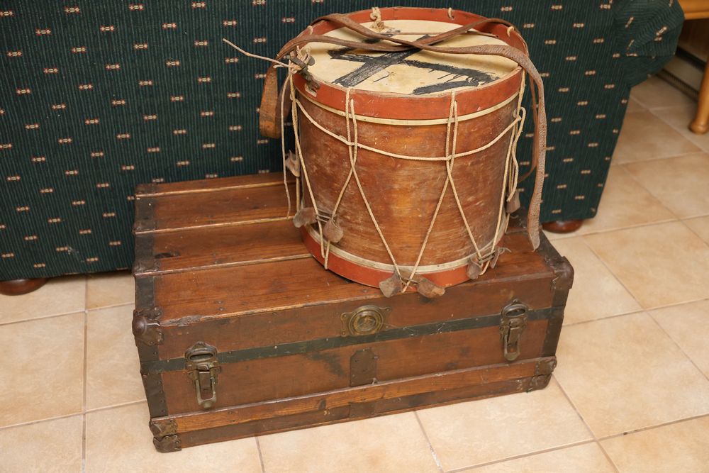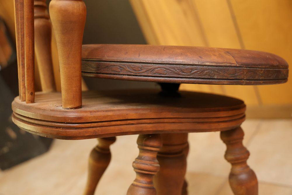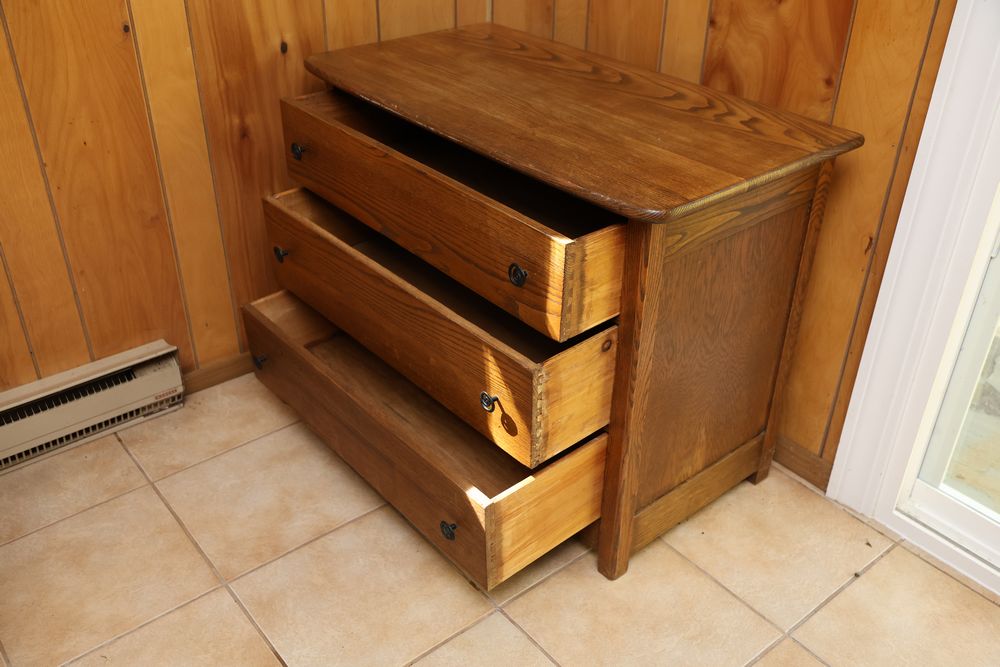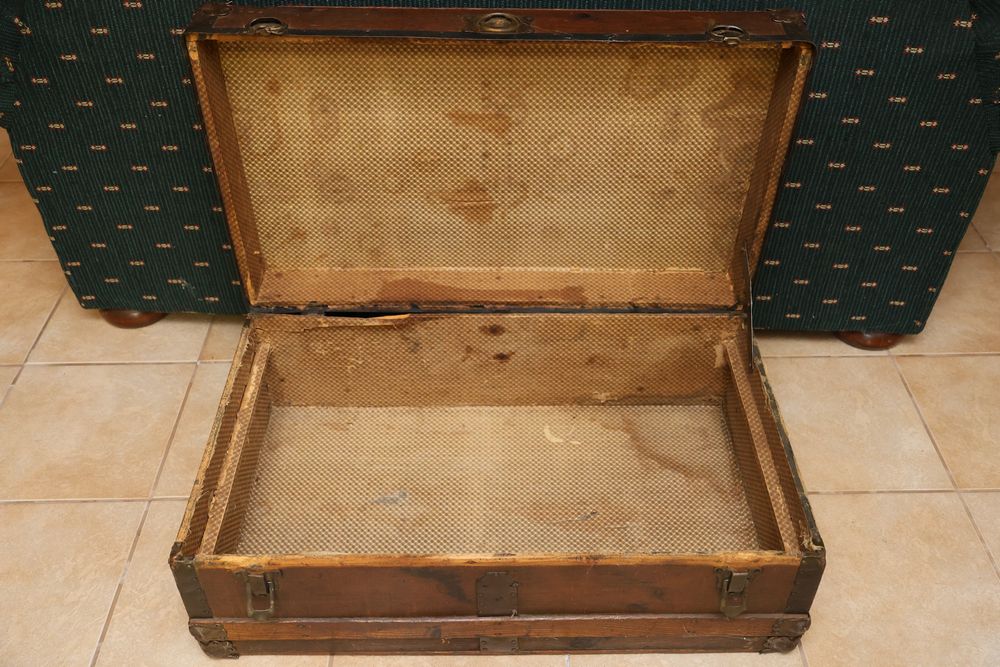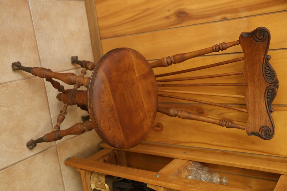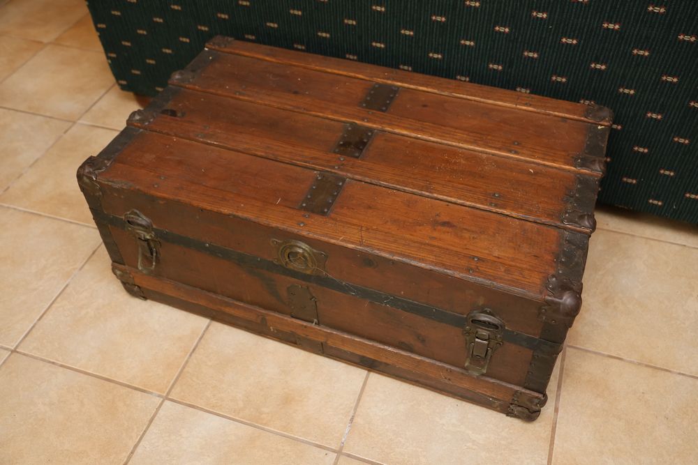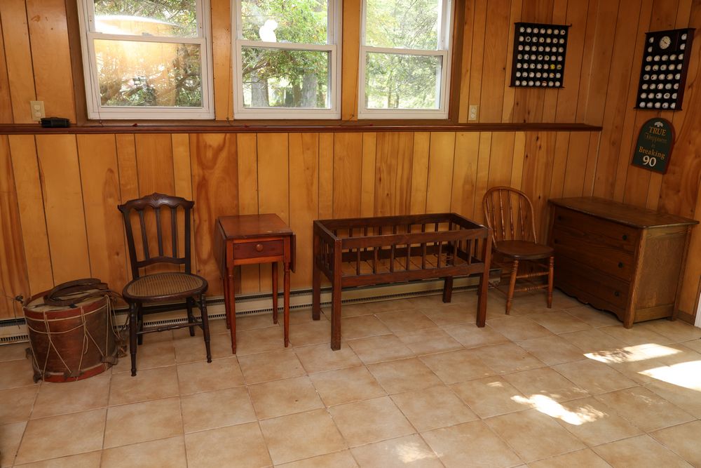 Wooden Furniture Set with Trunk, Cradle, Chairs, Table, and Chest of Drawers. Includes a wooden trunk with metal accents and functional latches, a three-drawer wooden chest 36"W x 19"D, a wooden bookshelf 37.5"W x 12"D x 75"H, a wooden cradle with a lattice bottom, a small wooden side table with a single drawer, and multiple wooden chairs with varied designs. This set offers a diverse array of wooden furniture pieces. Does not include items from other lots. Buyer is responsible for all materials and help necessary for safe and proper removal. Buyer must take all. Pickup only.