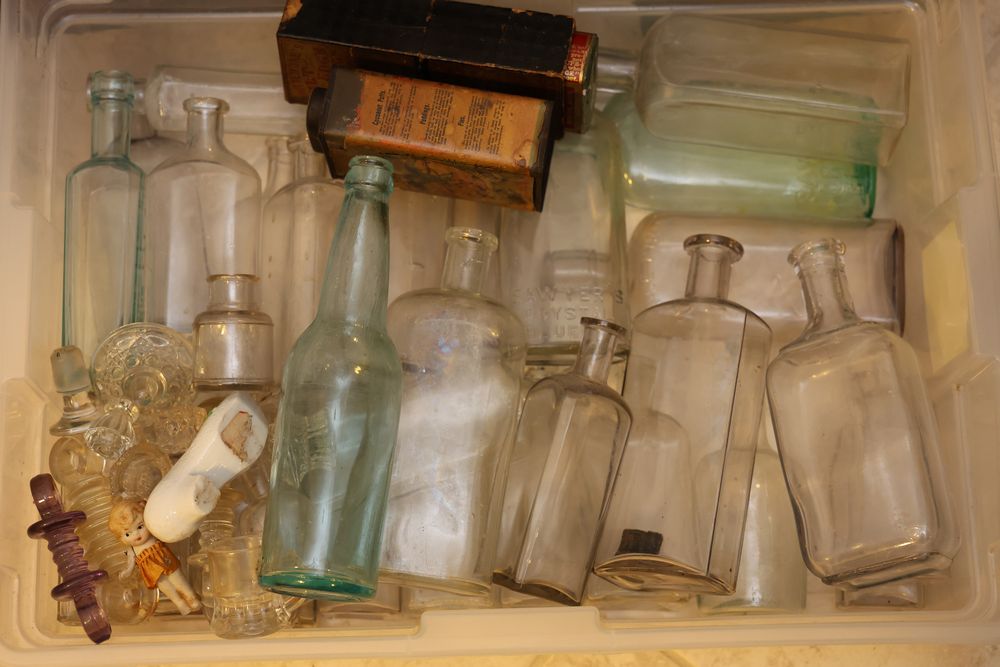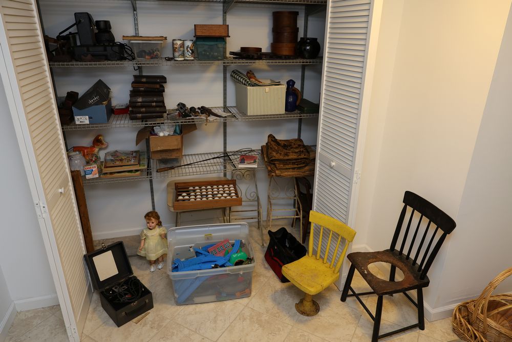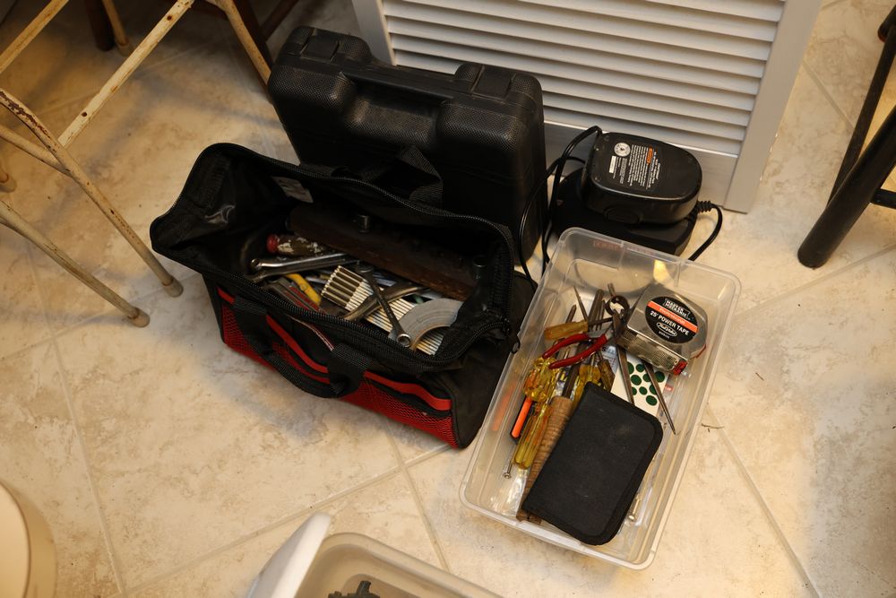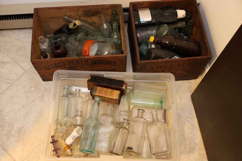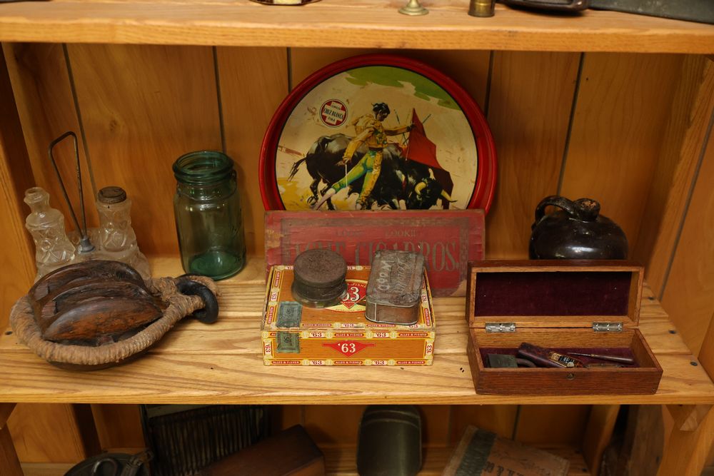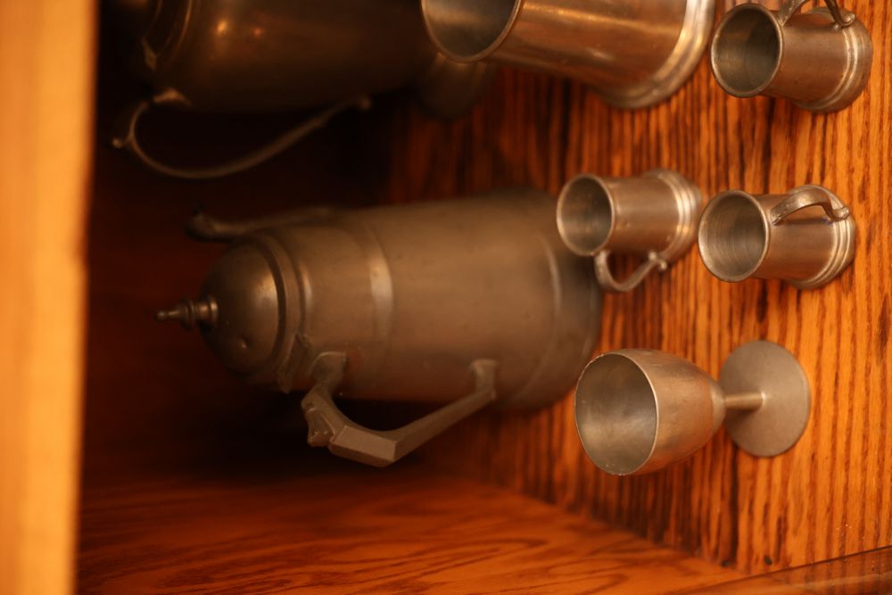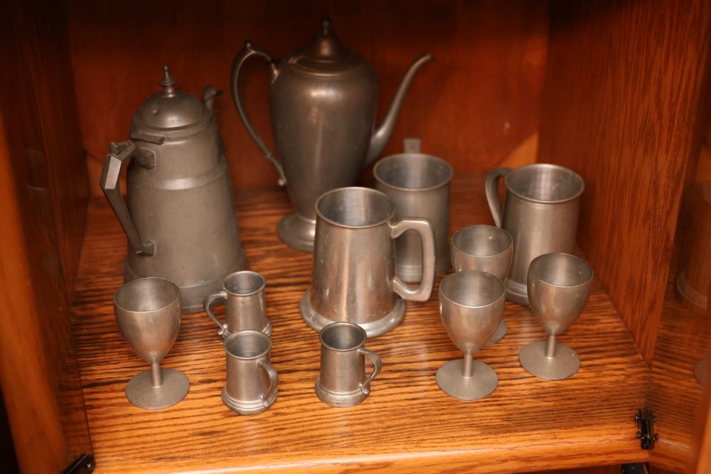 Pewter Items, Tools, Glass Bottles, Avon Decor, Kitchen Utensils, Large Lamp, Wall-Mounted Telephone. Includes a selection of pewter items such as mugs and pitchers, a variety of hand tools, an assortment of glass bottles, Avon decorative porcelain, kitchen utensils like knives and measuring cups, a large lamp with metal detailing, and a vintage wall-mounted rotary telephone. Seller reports phone was operational with last use. Does not include items from other lots. Does not include 5-tier bookshelf. Buyer is responsible for all materials and help necessary for safe and proper removal, as well as removal up to the first disconnect. Buyer must take all. Pickup only.