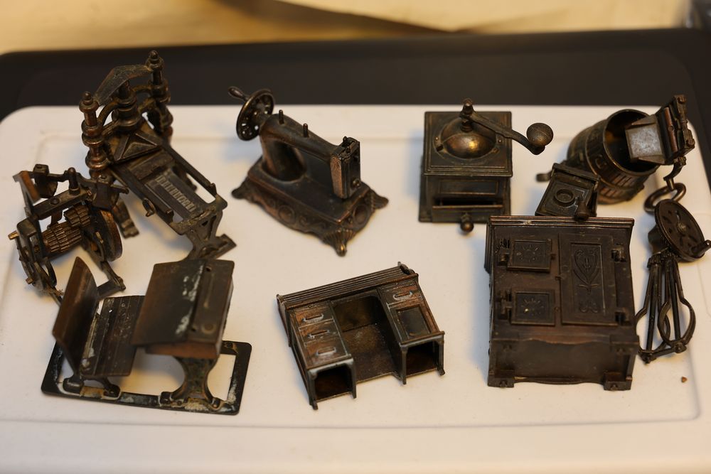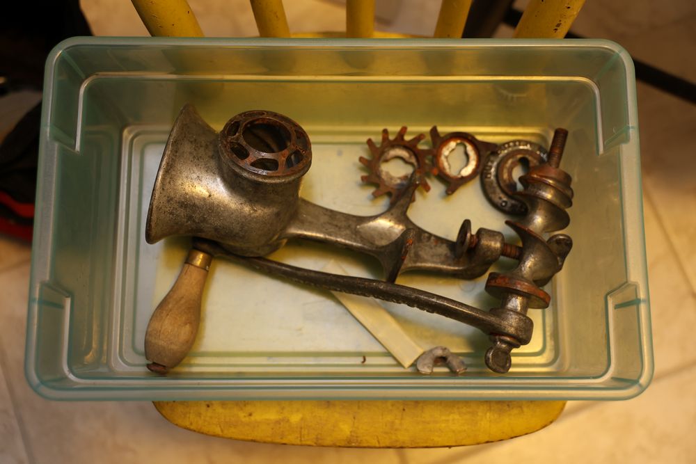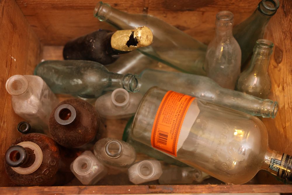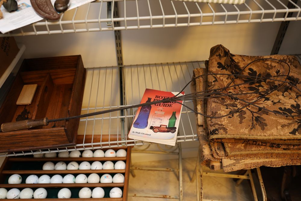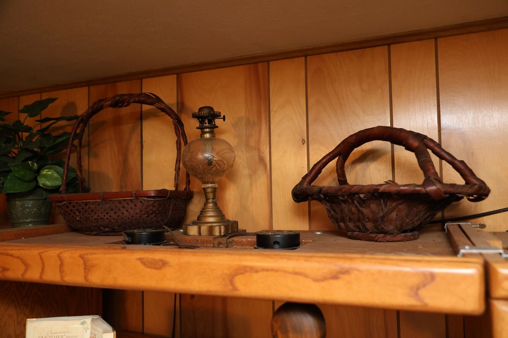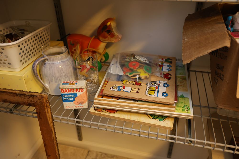 Pewter Items, Tools, Glass Bottles, Avon Decor, Kitchen Utensils, Large Lamp, Wall-Mounted Telephone. Includes a selection of pewter items such as mugs and pitchers, a variety of hand tools, an assortment of glass bottles, Avon decorative porcelain, kitchen utensils like knives and measuring cups, a large lamp with metal detailing, and a vintage wall-mounted rotary telephone. Seller reports phone was operational with last use. Does not include items from other lots. Does not include 5-tier bookshelf. Buyer is responsible for all materials and help necessary for safe and proper removal, as well as removal up to the first disconnect. Buyer must take all. Pickup only.