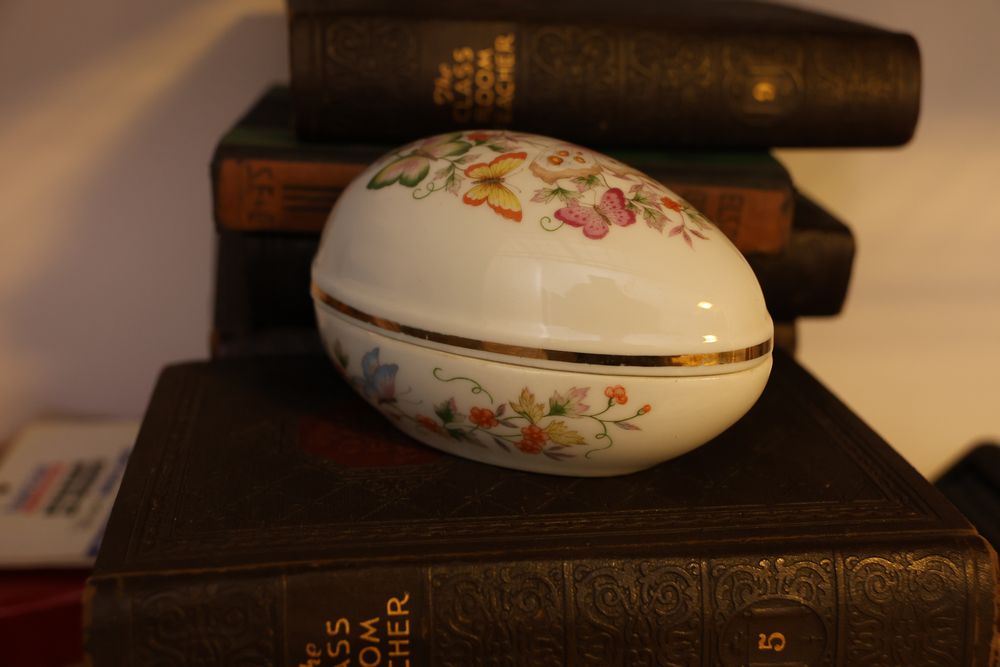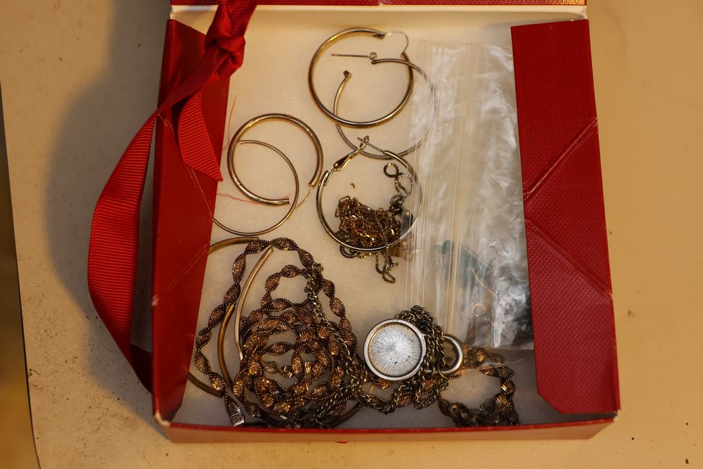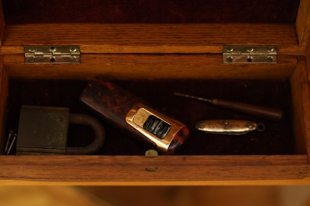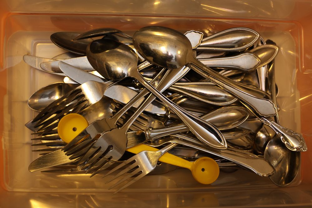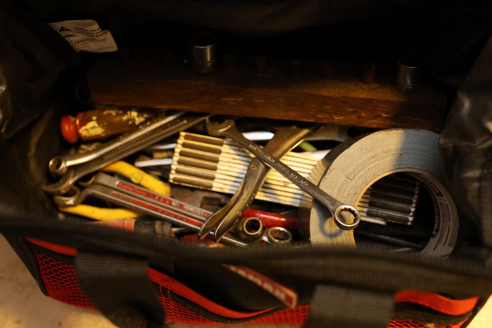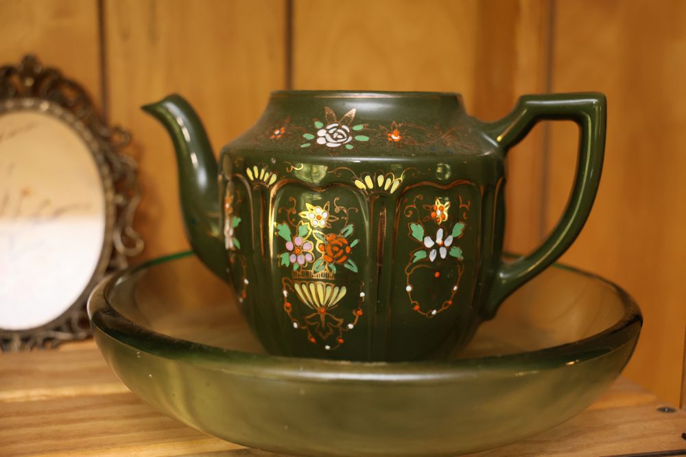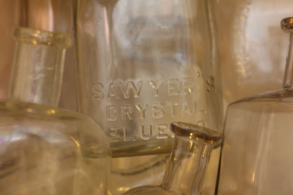 Pewter Items, Tools, Glass Bottles, Avon Decor, Kitchen Utensils, Large Lamp, Wall-Mounted Telephone. Includes a selection of pewter items such as mugs and pitchers, a variety of hand tools, an assortment of glass bottles, Avon decorative porcelain, kitchen utensils like knives and measuring cups, a large lamp with metal detailing, and a vintage wall-mounted rotary telephone. Seller reports phone was operational with last use. Does not include items from other lots. Does not include 5-tier bookshelf. Buyer is responsible for all materials and help necessary for safe and proper removal, as well as removal up to the first disconnect. Buyer must take all. Pickup only.