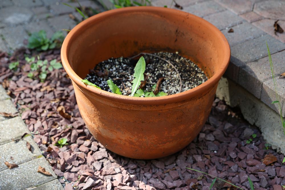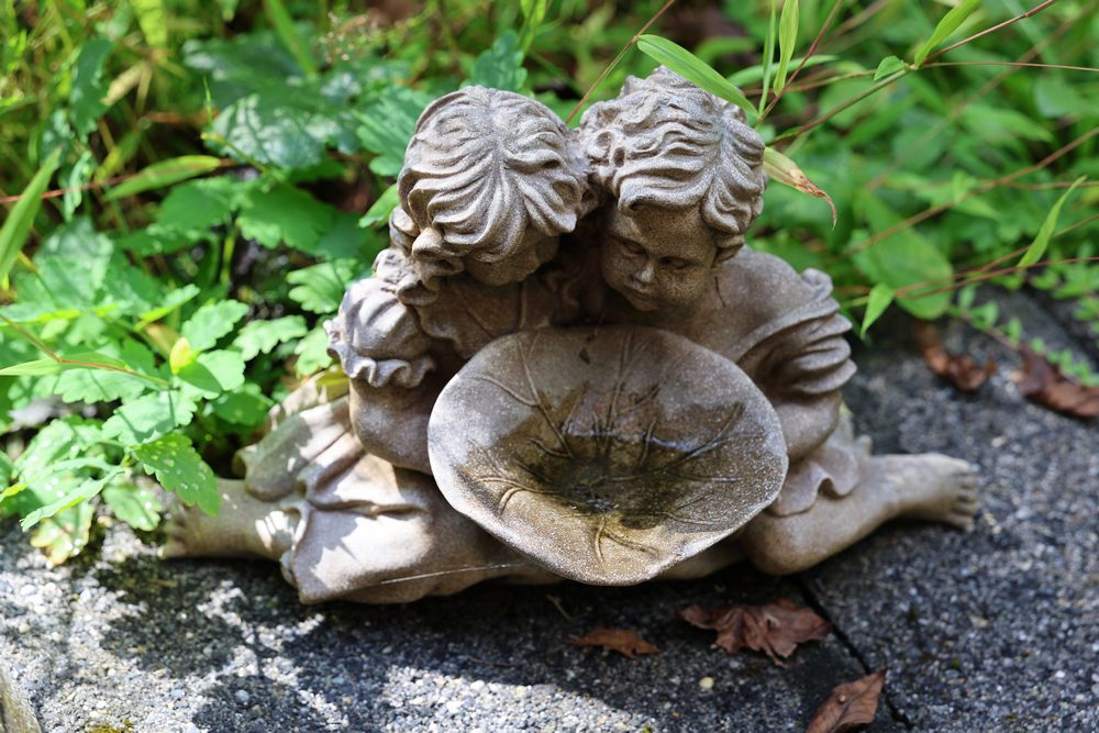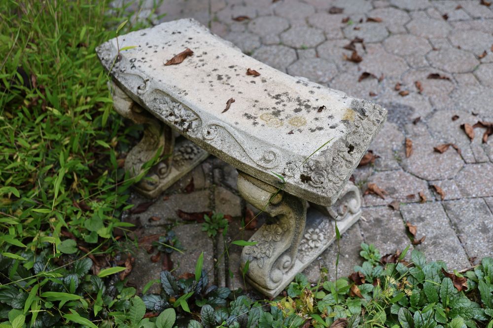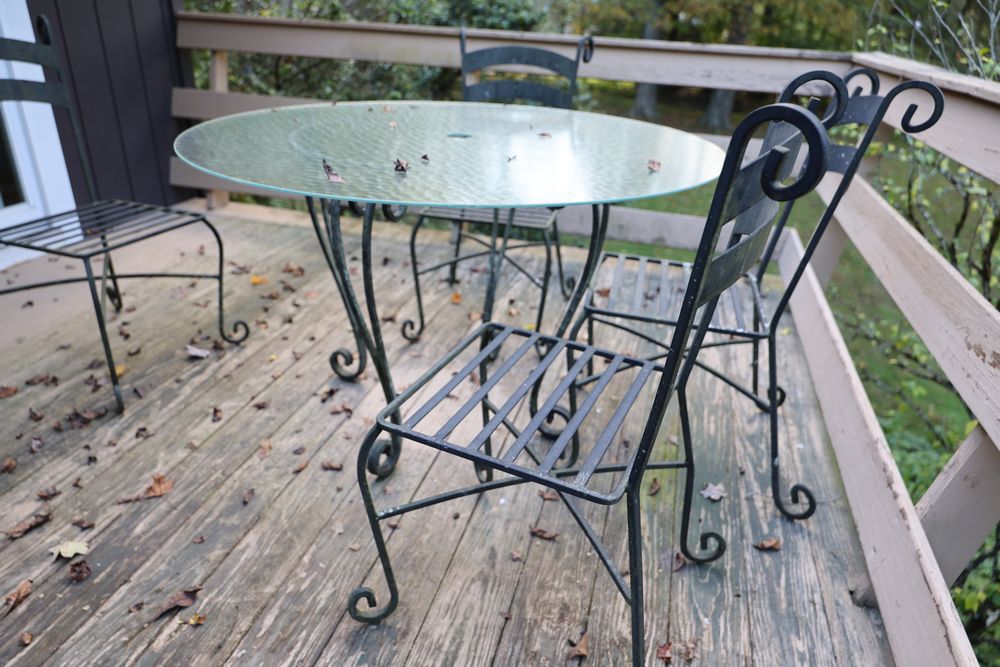 Outdoor Garden and Patio Furniture and Decorations. Includes a stone bench, a metal-framed glass-top table, four metal chairs with decorative backs, multiple terracotta pots, a decorative wrought iron stand with glass top, a garden sculpture, and a garden bench with metal backrest. Buyer must take all. Pickup only.