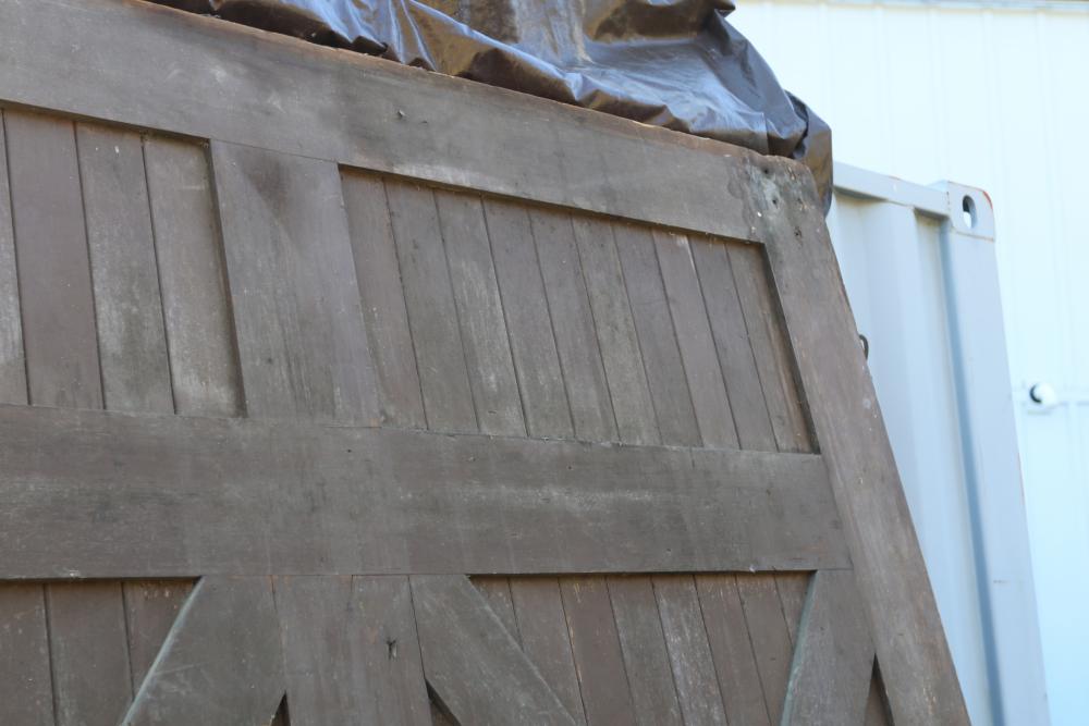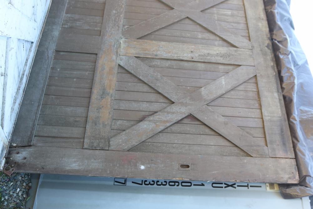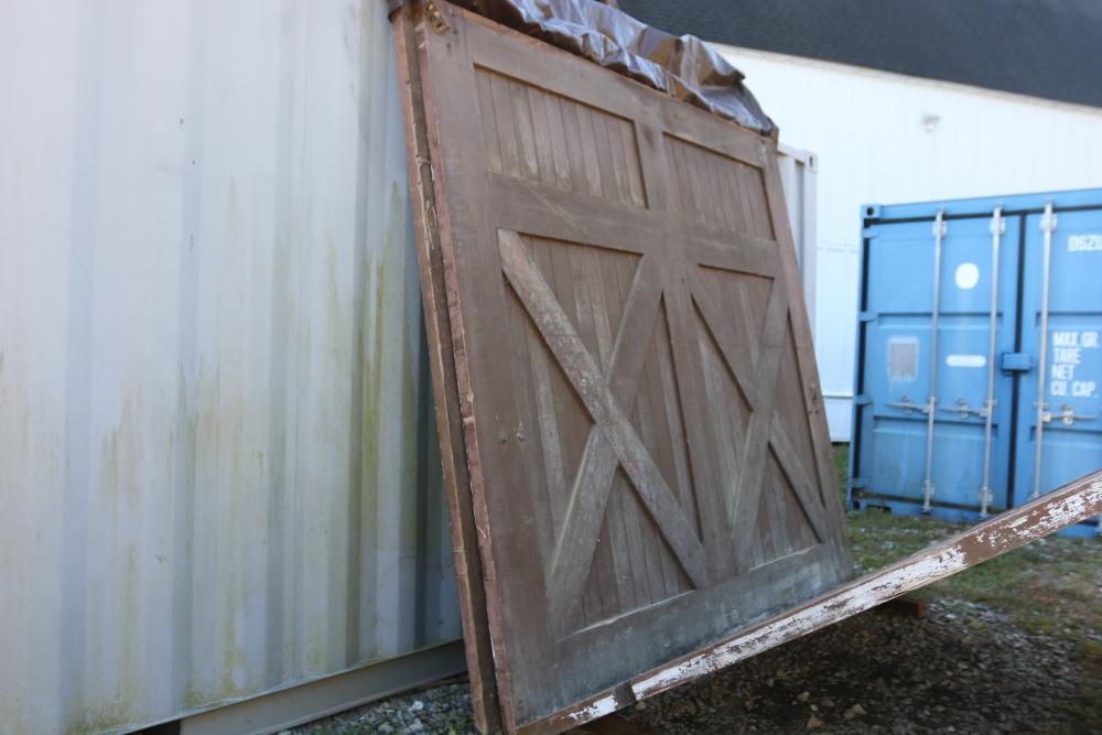 Three Carriage Barn Doors measuring approximately 94.5"H x 97.5"W x 2-1/8"D each. These barn doors display a traditional cross-brace pattern on both sides. One side features a painted finish, while the other side showcases a natural wooden surface. Some original hardware pieces remain partially attached. No additional hardware included. Seller reports: Origins are from Newburgh Carriage House. Buyer is responsible for help and materials necessary for removal. Buyer must take all. Pickup only.