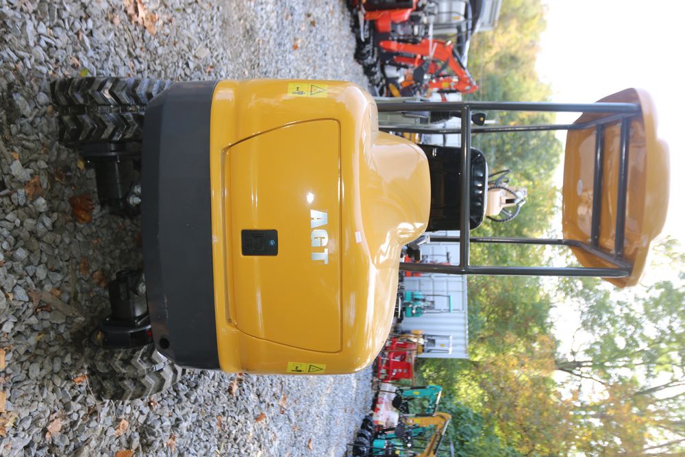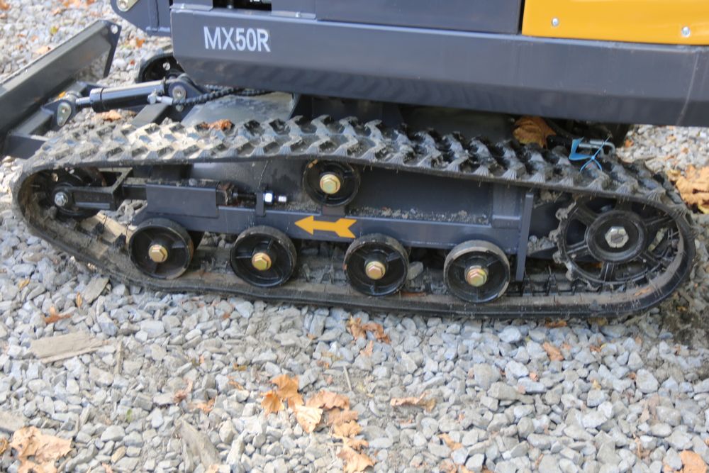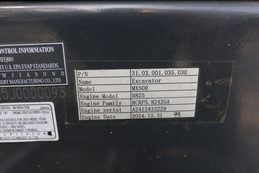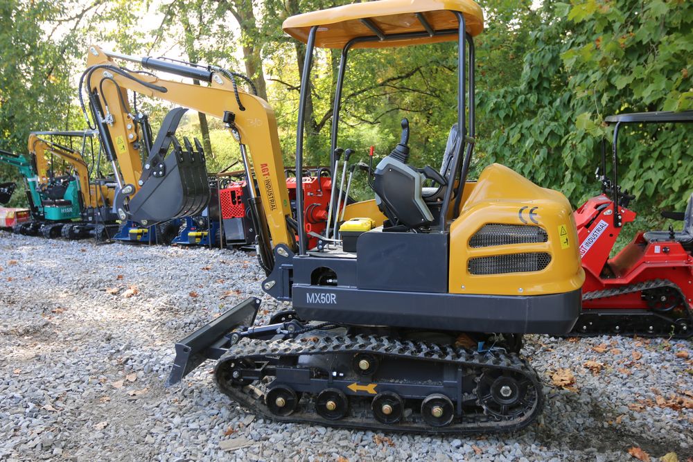 ATG Industrial MX50R mini excavator with a 1700 kg load capacity. Features include a R825 engine model, a hydraulic thumb, and off-road undercarriage expansion. Includes a dozer blade, tracked base, and ergonomic operator seat. Less than 1 hour of use.