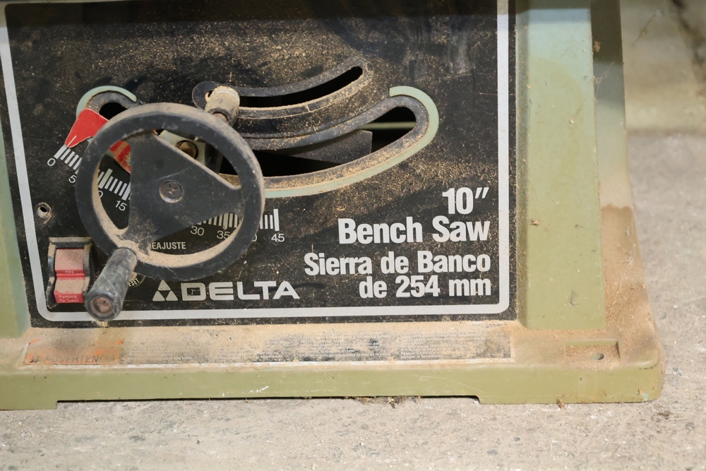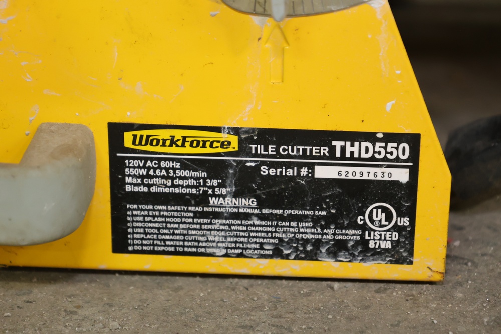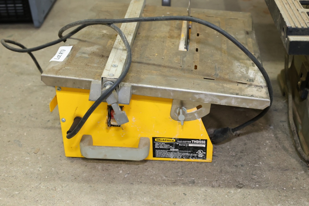 Delta 10" bench saw with blade height and angle adjustment, identified as a 254 mm table saw, designed for woodworking applications. Accompanied by a WorkForce tile cutter, model THD550, rated at 120V AC, 60Hz, 550W, with a maximum cutting depth of 1 3/8" and blade dimensions of 7" x 5/8". The tile cutter includes serial number 62097630 and operates at 3,500 RPM. Both tools are mounted as standalone bench units.