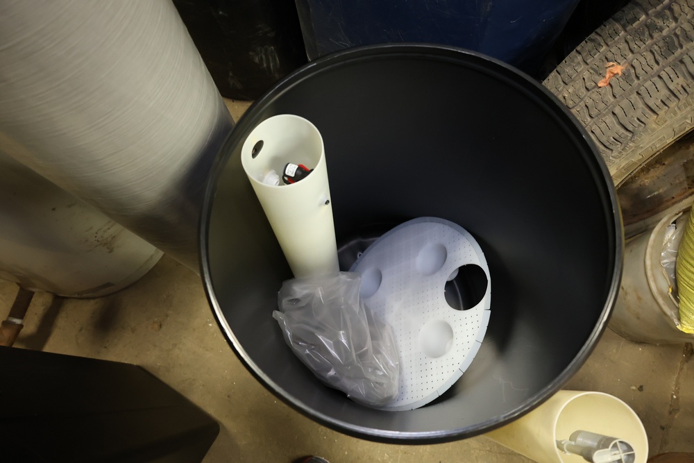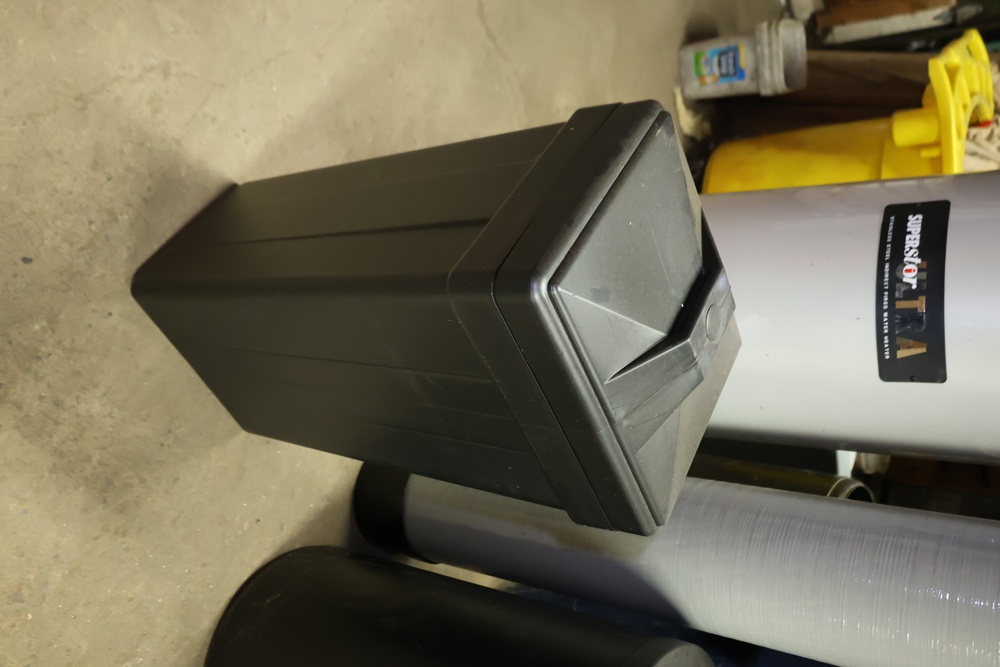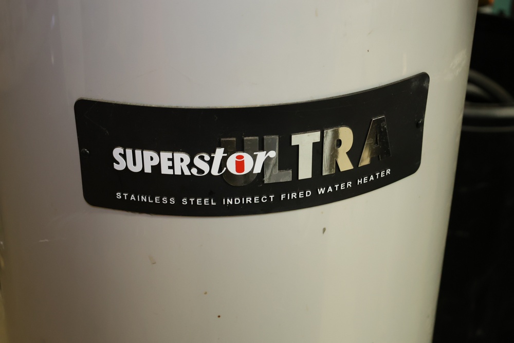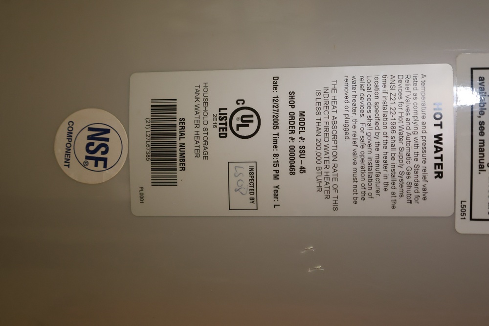 Superstor model SSU-45 stainless steel indirect fired water heater, manufactured 12/27/2005, with NSF certification and UL listing. Includes Water-Right Impression Plus water conditioning system consisting of mineral tank, brine tank, and digital control head. The digital controller provides programmable regeneration cycles and clock-based operation. No additional media, plumbing components, or accessories are included beyond those shown.