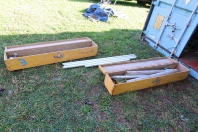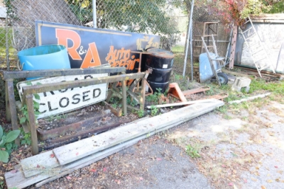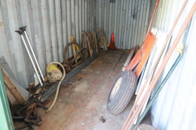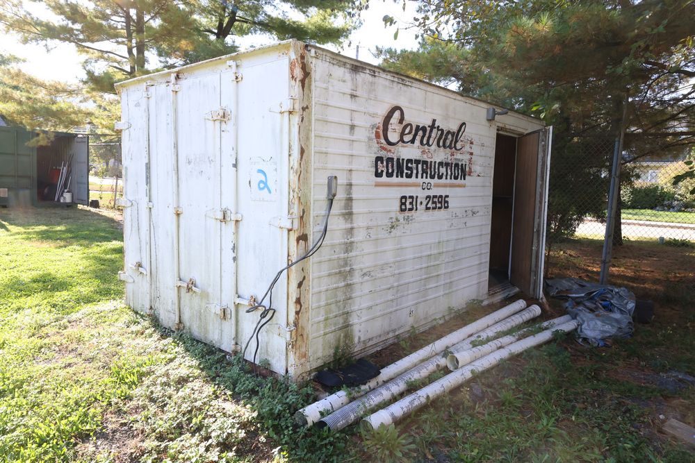 Items include Clark Bobcat Model 825 Hydrostatic Skid Steer Loader, Portable metal-sided office trailer, Conex containers, Micro-Grade Laser System, building materials, tools, tires and more. Items are located in Beacon, NY.