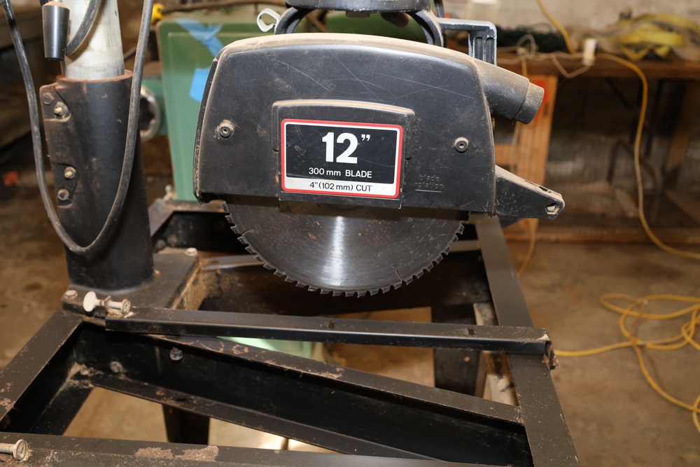 DeWalt model 7790 12" radial arm saw, 3½ HP dual-voltage motor with automatic brake, mounted on a heavy-duty steel stand. Features adjustable arm with bevel and miter capability, 12" (300mm) blade capacity, and cutting depth up to approximately 4" (102mm). Equipped with Contractor’s PowerShop controls, angle gauge, and integrated handle adjustments for precision crosscuts, bevels, and compound miters. Designed for woodworking, framing, and general shop applications.