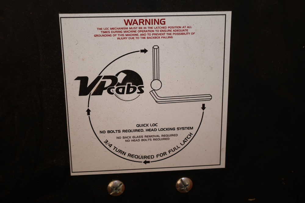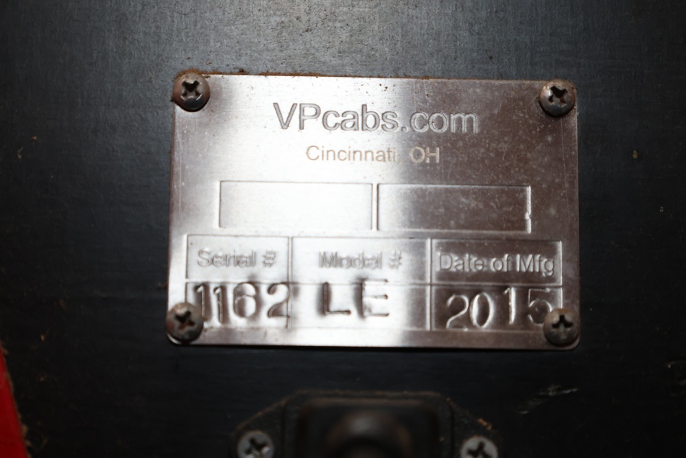 VPcabs digital pinball machine, model LE, serial no. 1162, manufactured in 2015 by VPcabs, Cincinnati, Ohio. The cabinet features custom “JW GFX” artwork, a full digital playfield display, coin door with dual coin slots, and illuminated control buttons including Start, Exit, and Launch Ball. Equipped with the VPcabs Quick Loc head locking system requiring no bolts or glass removal. Unit did not power on when tested and may require repair to operate.