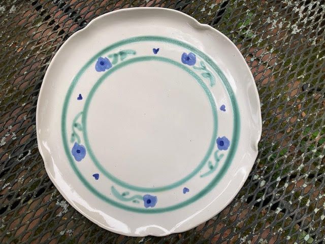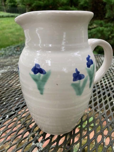 A collection of classic Polly Myhrum Pottery pieces - a pitcher, a bowl and a plate. Polly Myhrum has been creating handmade dinnerware and decorative objects for nearly 50 years in a simple, understated style with a touch of whimsy. The pieces are white, with hand-painted floral patterns in a combination of blue and green. The underglaze designs are covered with a white glaze, softening the colors. Each piece of white stoneware is fired to 2300 degrees Fahrenheit, which makes it durable and dishwasher/microwave safe. Collection includes one 4-cup pitcher that measures 7" tall and 3.59" diameter; one plate measuring 11.5 inches diameter; and one 12-cup bowl measuring 4.75" tall and 10.5" diameter. Note: Polly Myhrum pottery will be ending production in 2025. https://www.pollymyhrumpottery.com/