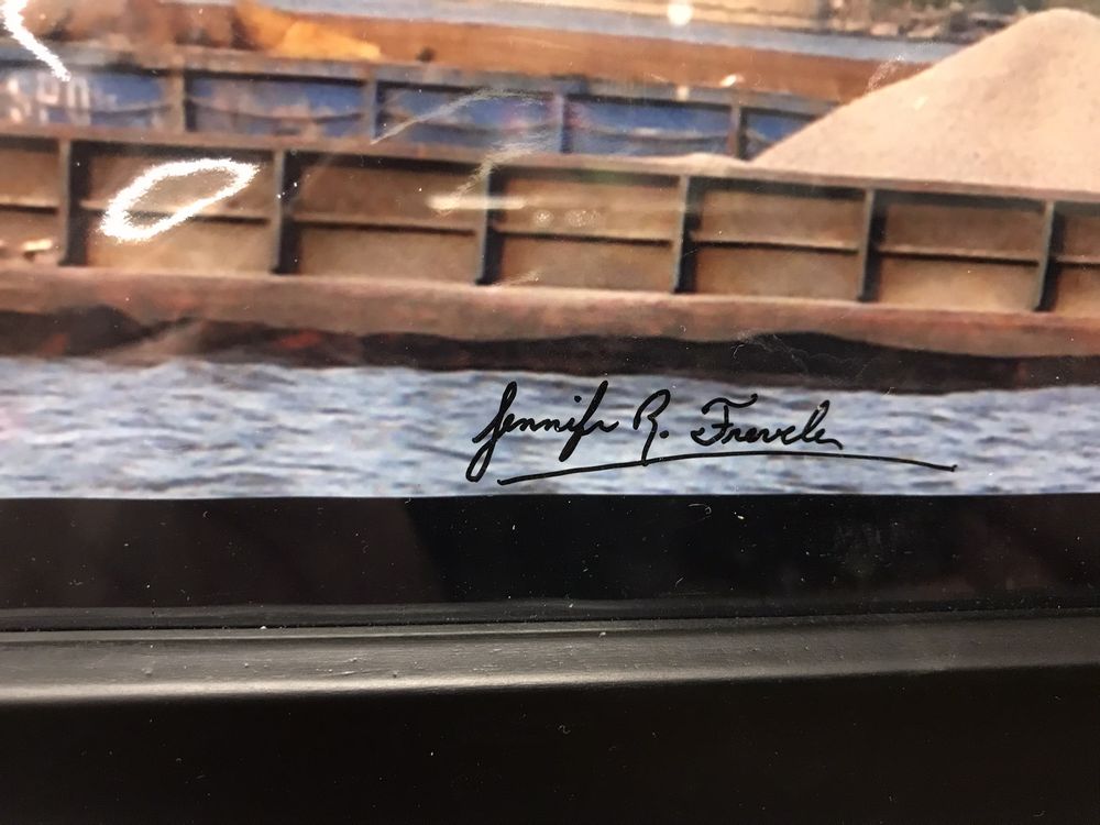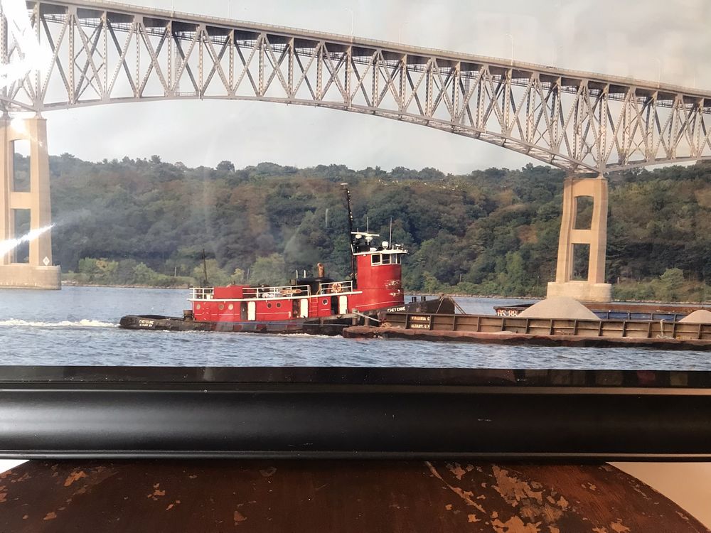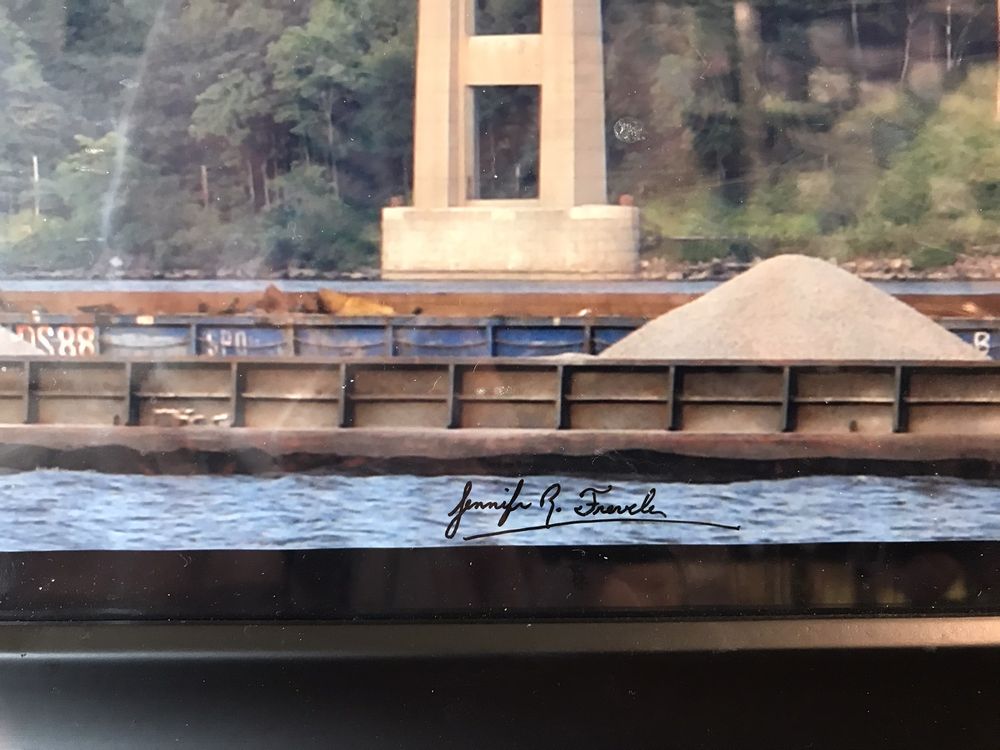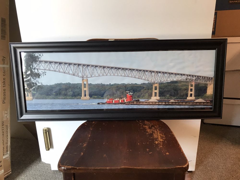 Large framed photograph of the George Clinton Kingston-Rhinecliff Bridge with a barge passing below on the Hudson River. Photographer Jennifer Fravele. Pickup Only, Rhinebeck, NY.
