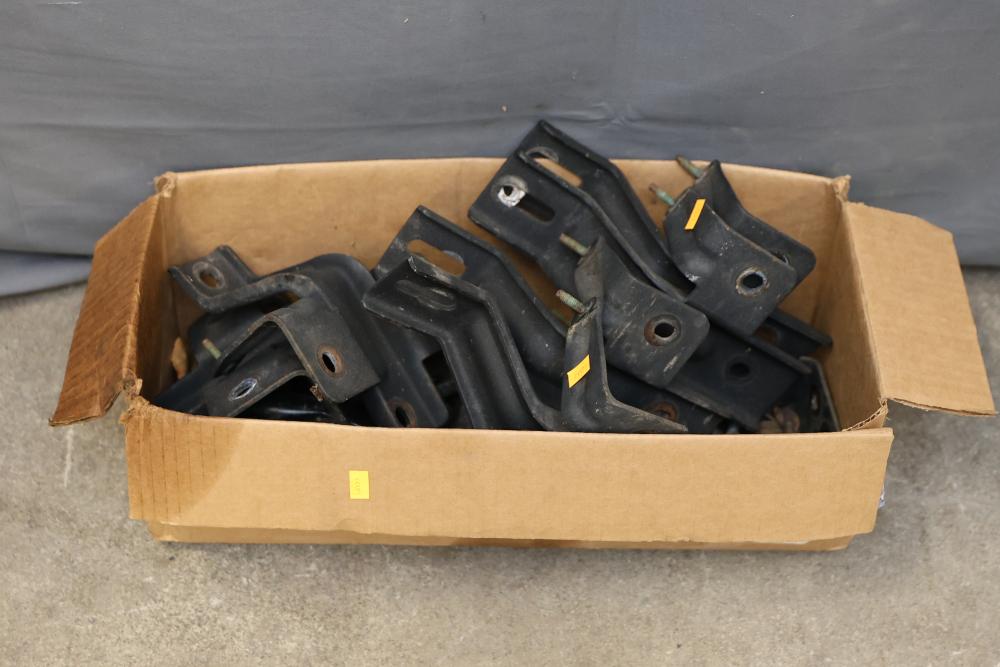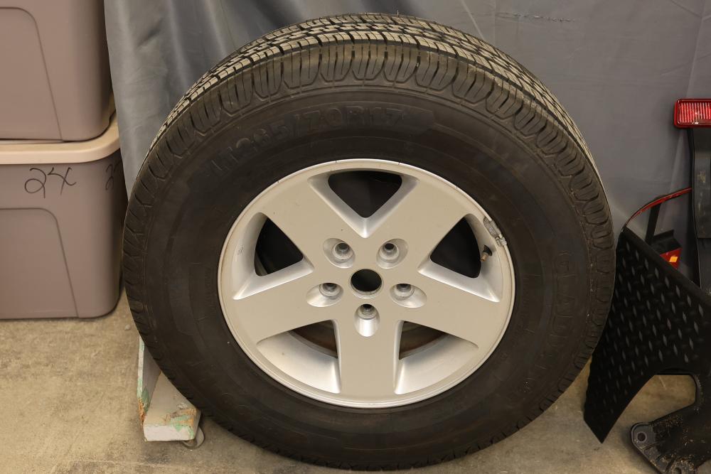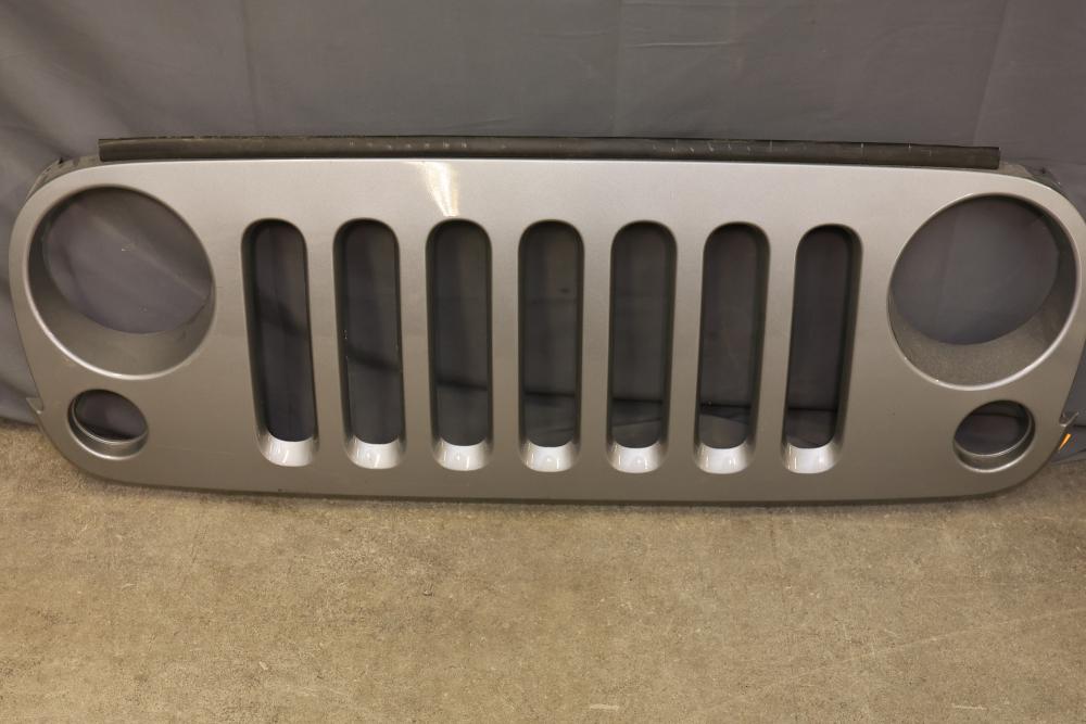 Parts for a 2015 Jeep Wrangler JK Including Bumpers, Grille, Step Rails, Brackets, and Spare Tire. This includes front and rear bumpers, a silver front grille with seven slots, step rails, various brackets and hardware, and a spare tire with aluminum rim. These components appear to be original equipment for the specified vehicle model year. Pickup only.