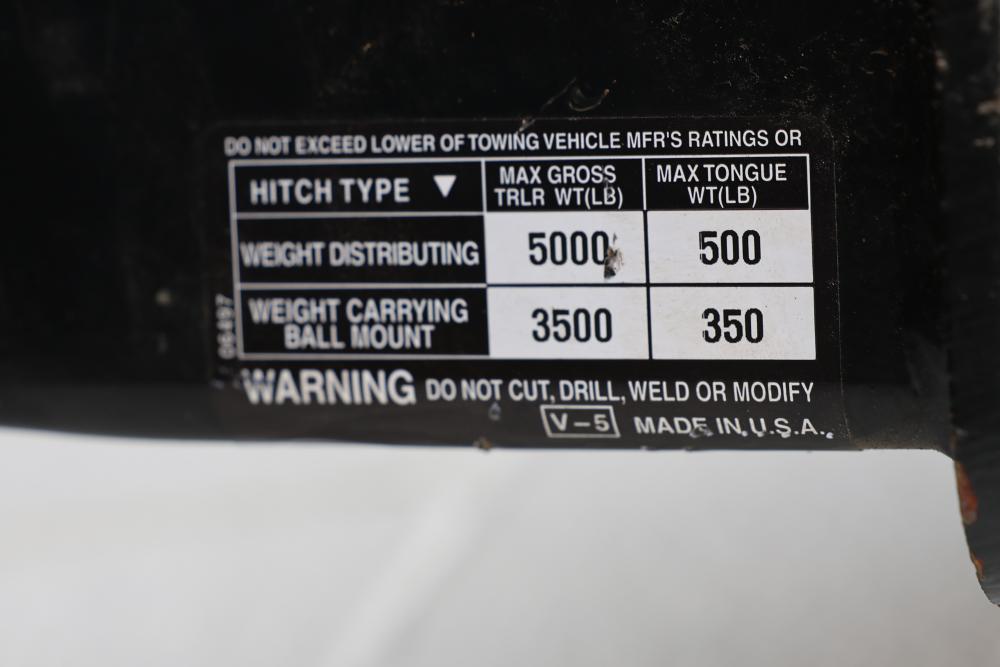 Draw-Tite Hitch with 2 Inch Square Receiver Opening, 37 Inches in Length. Weight distributing capacity of 5000 lb maximum gross trailer weight (WTL) and 500 lb maximum tongue weight (WTL). Weight carrying ball mount capacity of 3500 lb maximum gross trailer weight (WTL) and 350 lb maximum tongue weight (WTL). Features a durable metal frame. Model Number 75089. Pickup only.