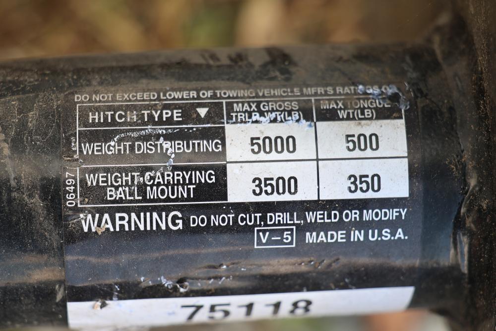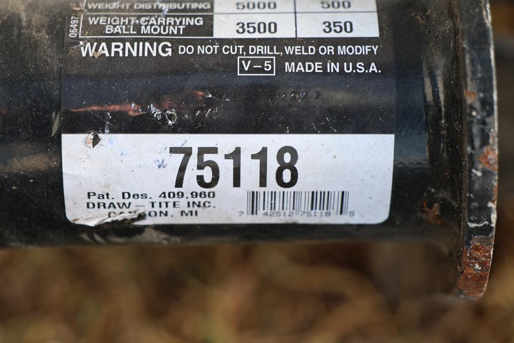 Draw-Tite Model 75118 trailer hitch featuring a 2-inch square receiver opening and overall length of 43 inches. Max gross trailer weight capacity of 5,000 lbs, tongue weight of up to 500 lbs when weight-distributing, or 3,500 lbs gross trailer weight and 350 lbs tongue weight when using a ball mount. Do not cut, drill, weld, or modify. Class 3 trailer hitch. Pickup only.