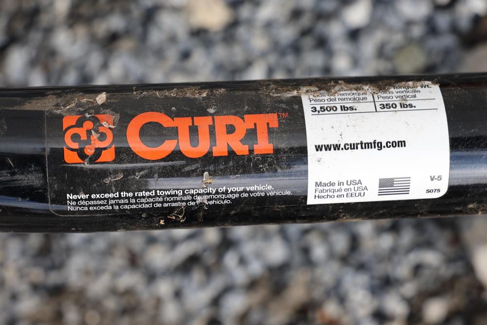 CURT V-5 trailer hitch featuring a 2 inch square receiver opening and measuring 54 inches in total length. Rated at 3,500 lbs towing capacity and 350 lbs tongue weight. Includes hardware, as shown. Ideal for compatible towing applications. Pickup only.