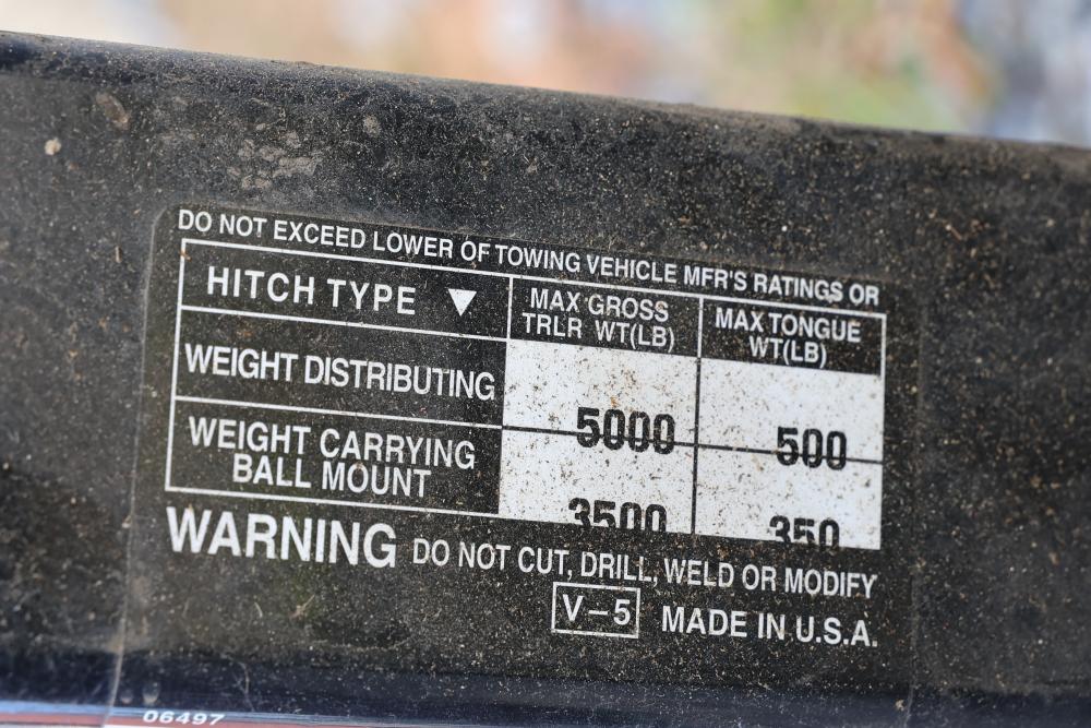 Trailer Hitch with 2 Inch Square Receiver Opening and 39.5 Inch Length. Includes specifications for weight capacity: 5,000 lbs max gross trailer weight and 500 lbs max tongue weight for weight-distributing setups, and 3,500 lbs max trailer weight and 350 lbs tongue weight for ball mount setups. Model number 75055, classified as V-5. Pickup only.