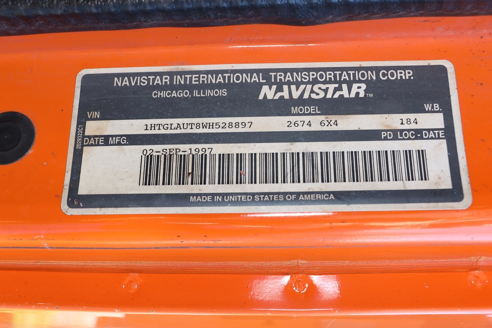 1998 International S2674. VIN: IHTGLAUT8WH528897. Odometer reading: 182020. Seller reports: Does not run/drive, no clutch due to rotted cab firewall, Rotted frame . Title & key available. Asset #: 1072.