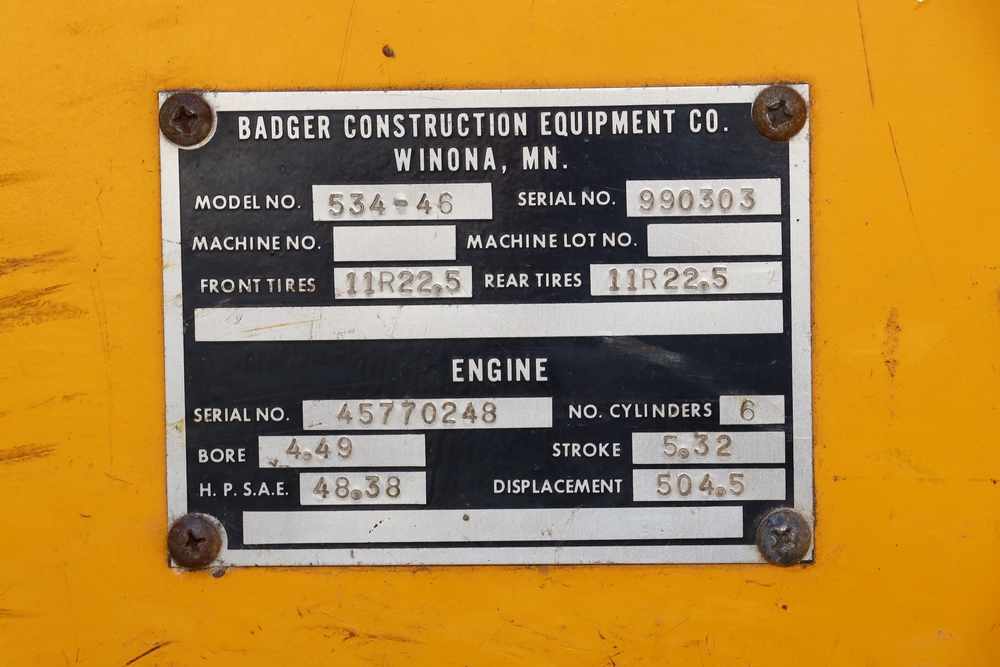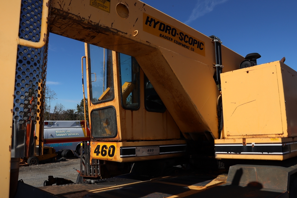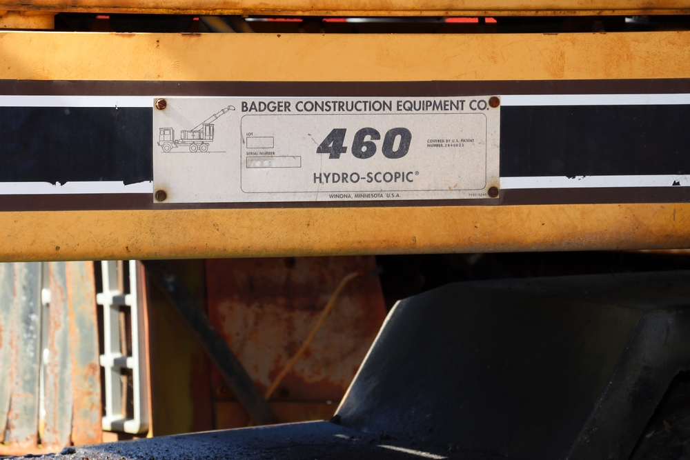 1999 Badger 460. SN: 990303. Hours/Odometer reading: 6,306/37,261. Seller reports: Does not run/drive, ran when parked, Hydraulic leak in boom, aged out. Registration Only, key available. Asset #: 1047A.