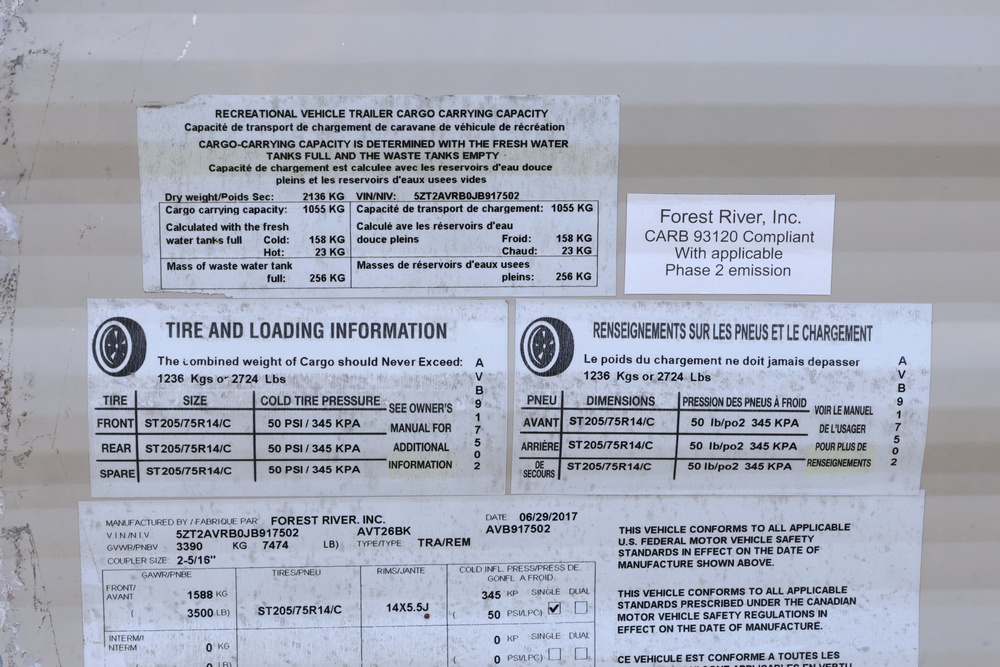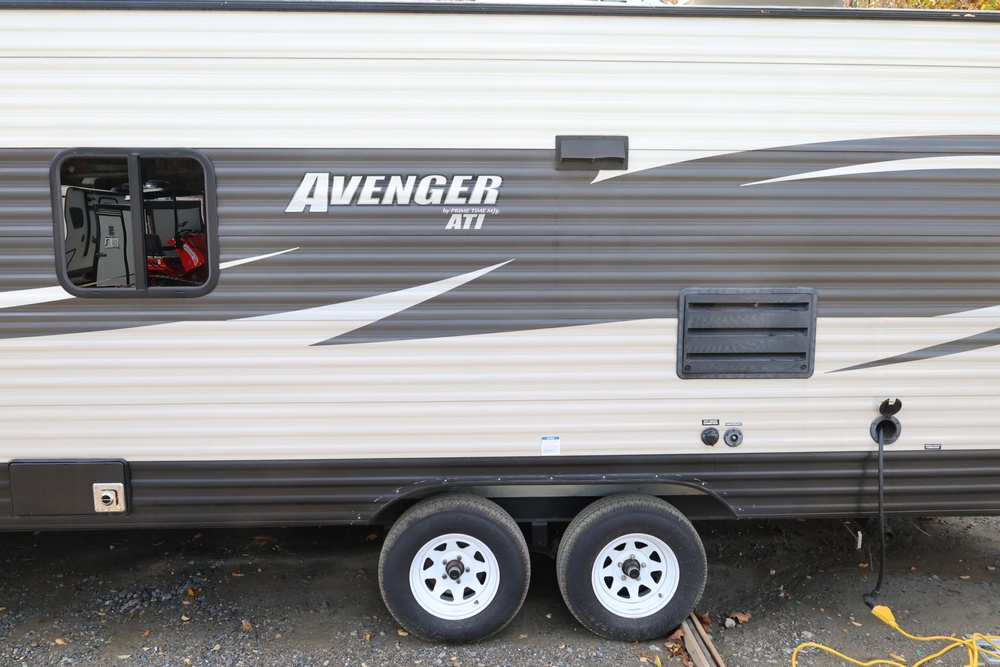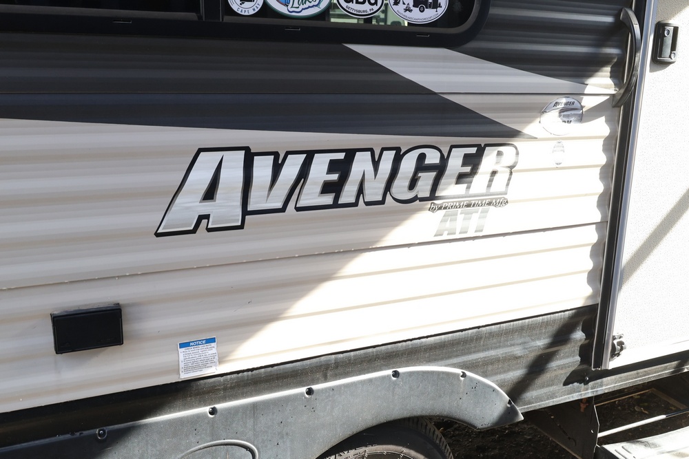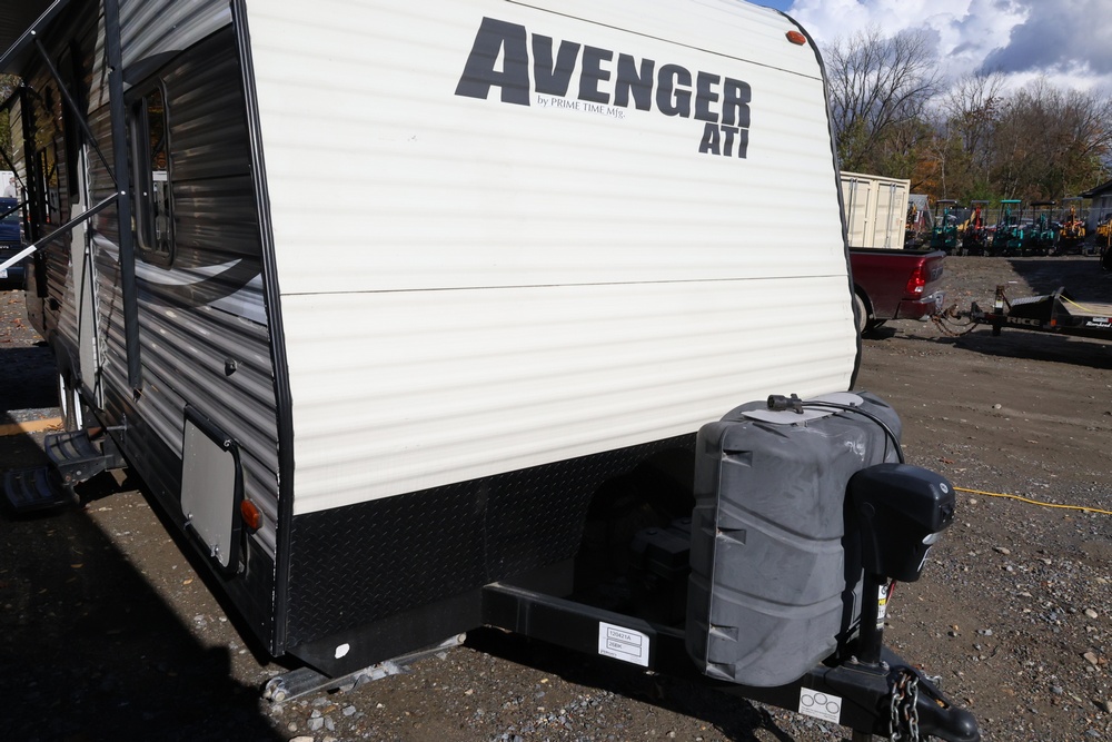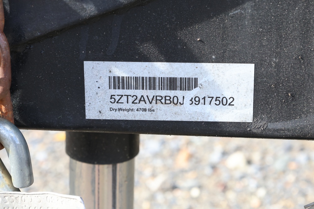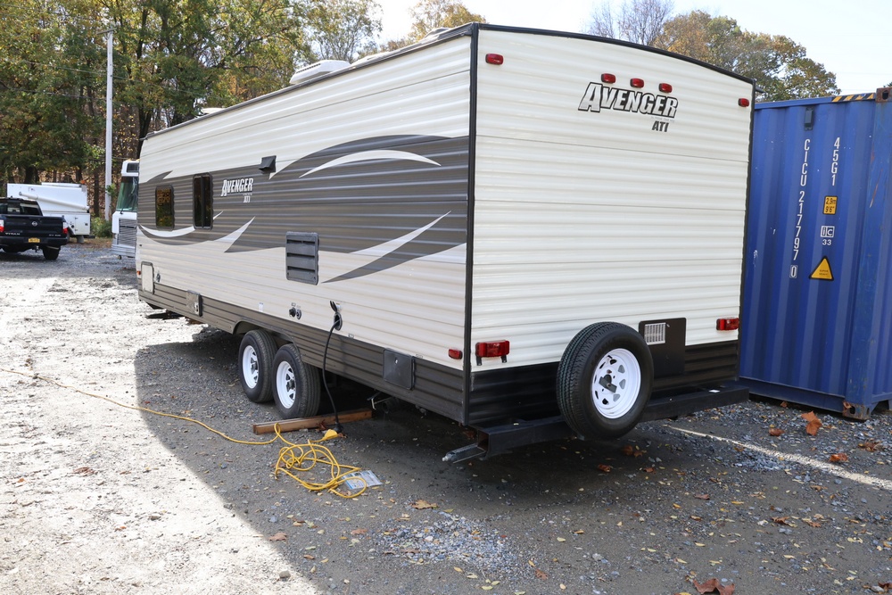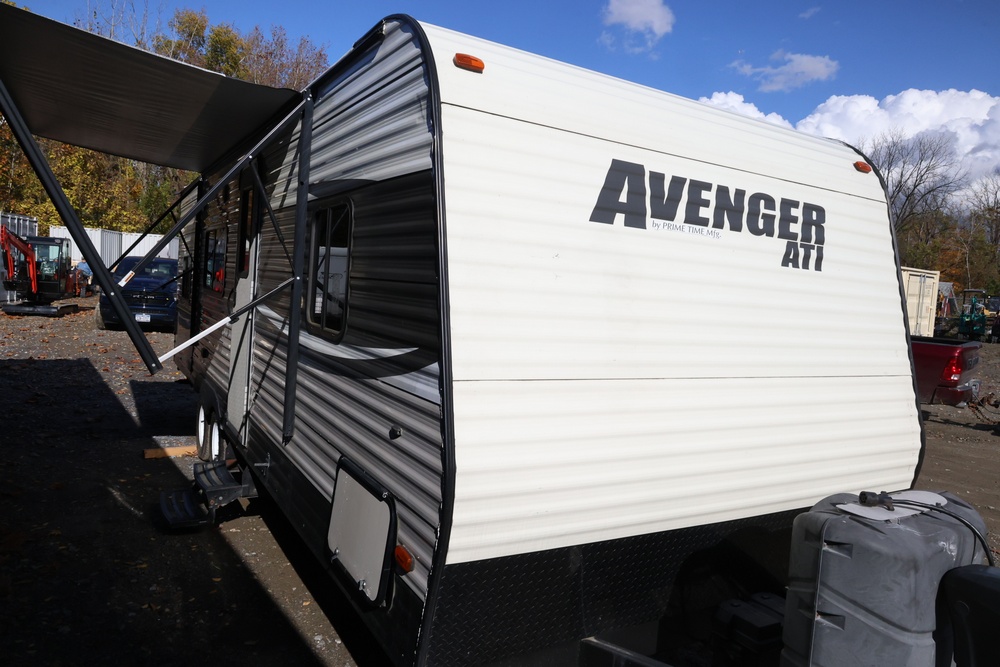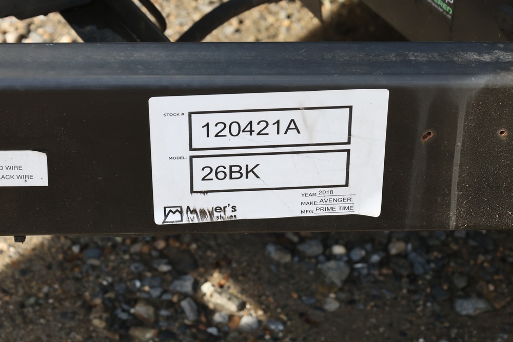 2018 Prime Time Avenger ATI 26BK travel trailer VIN: 5ZT2AVRB0JB917502 with a dry weight of 4,708 lbs and a GVWR of 7,474 lbs, offering a cargo capacity of 2,766 lbs. It features a front queen bed, rear bunk, a central kitchen and living area, and a full rear bathroom. The trailer includes an outdoor kitchen with a sink, mini fridge, and storage, as well as a spare tire and ST205/75R14C tires on 14x5.5 rims. It has a 2-5/16" coupler, a fresh water tank capacity of 158 kg, and a waste water tank capacity of 256 kg. The unit was manufactured by Forest River, Inc. on June 29, 2017. See photos of water leak in the front room. Title available. Title will transfer via dealer paperwork in Highland NY.