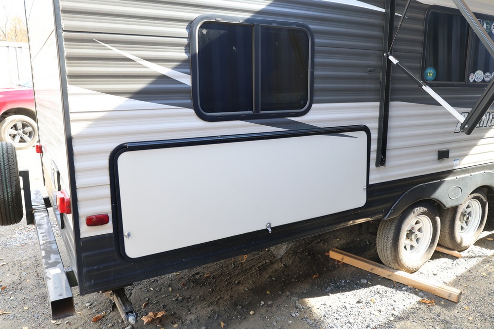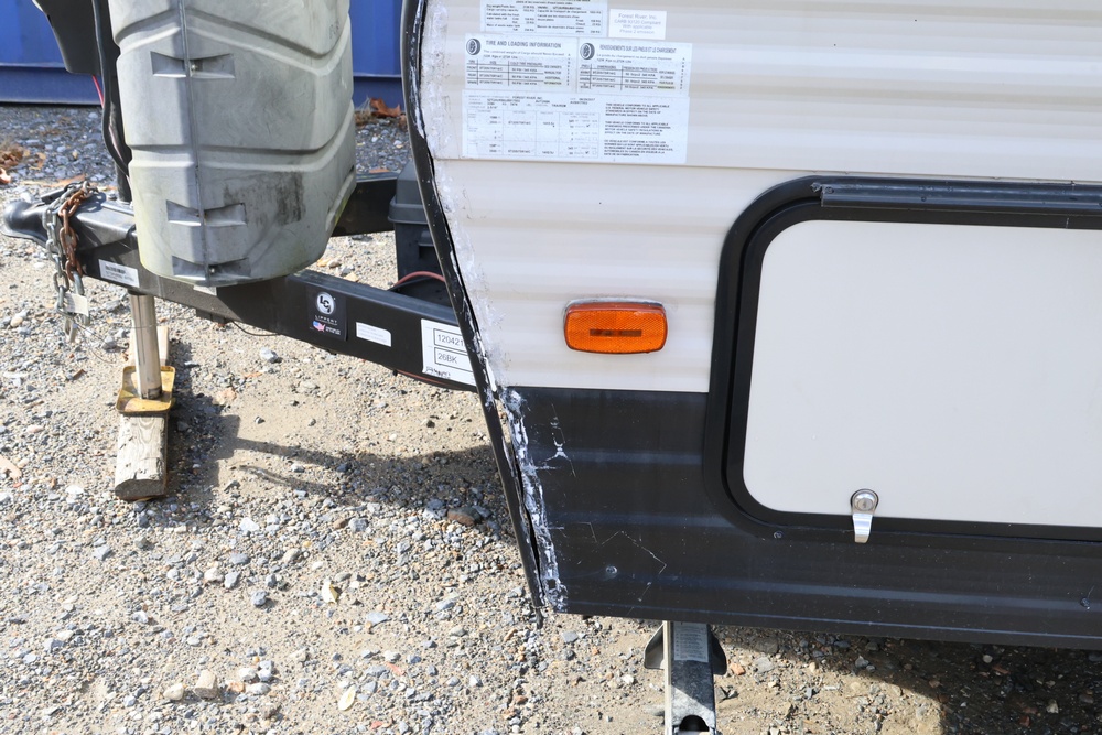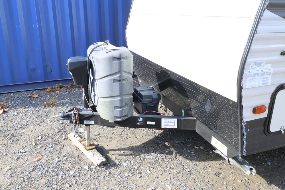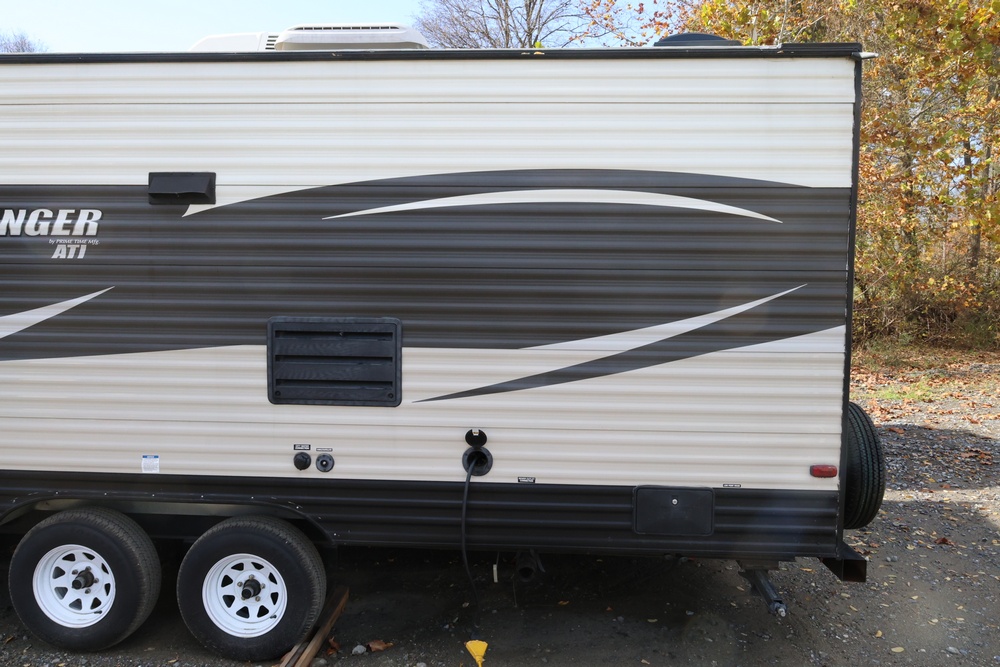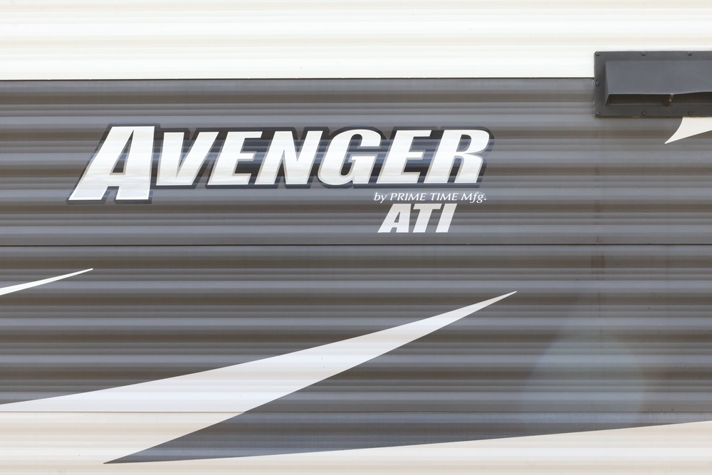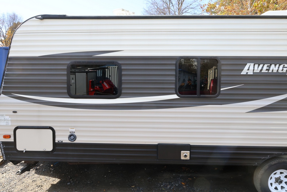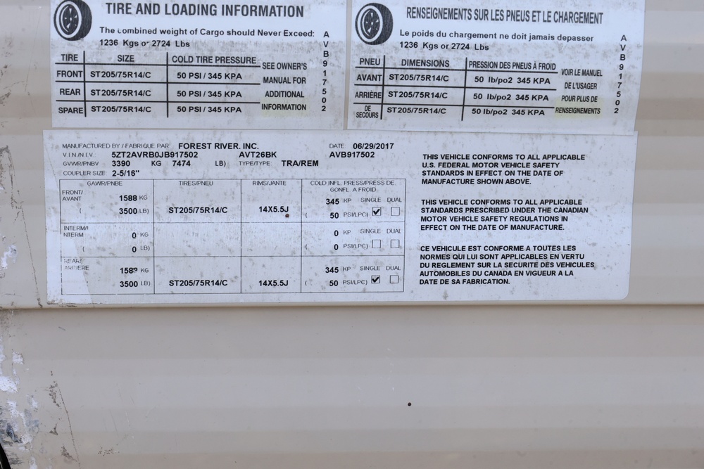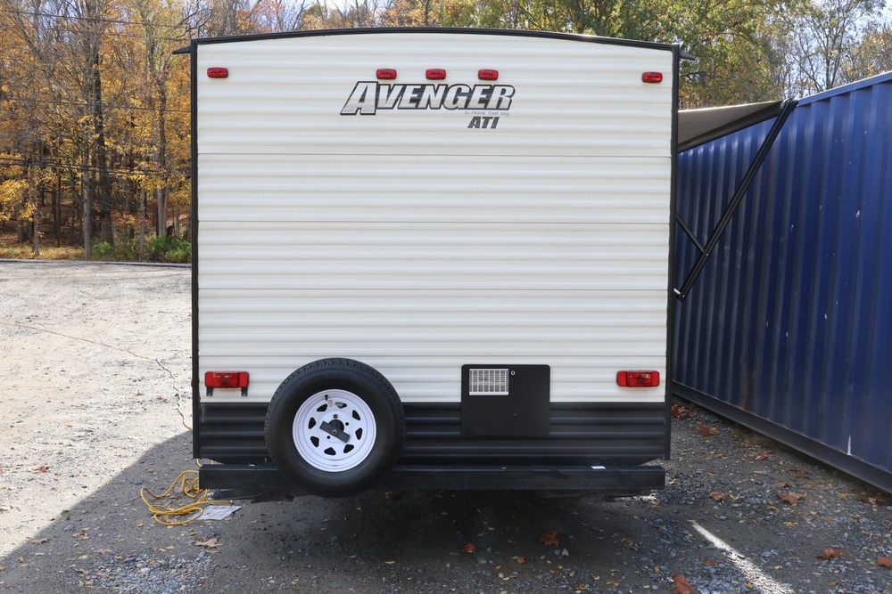 2018 Prime Time Avenger ATI 26BK travel trailer VIN: 5ZT2AVRB0JB917502 with a dry weight of 4,708 lbs and a GVWR of 7,474 lbs, offering a cargo capacity of 2,766 lbs. It features a front queen bed, rear bunk, a central kitchen and living area, and a full rear bathroom. The trailer includes an outdoor kitchen with a sink, mini fridge, and storage, as well as a spare tire and ST205/75R14C tires on 14x5.5 rims. It has a 2-5/16" coupler, a fresh water tank capacity of 158 kg, and a waste water tank capacity of 256 kg. The unit was manufactured by Forest River, Inc. on June 29, 2017. See photos of water leak in the front room. Title available. Title will transfer via dealer paperwork in Highland NY.
