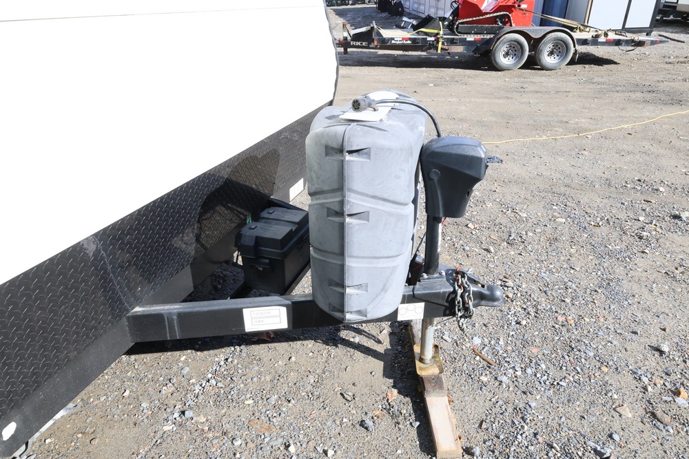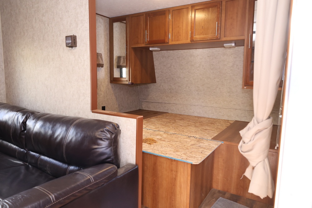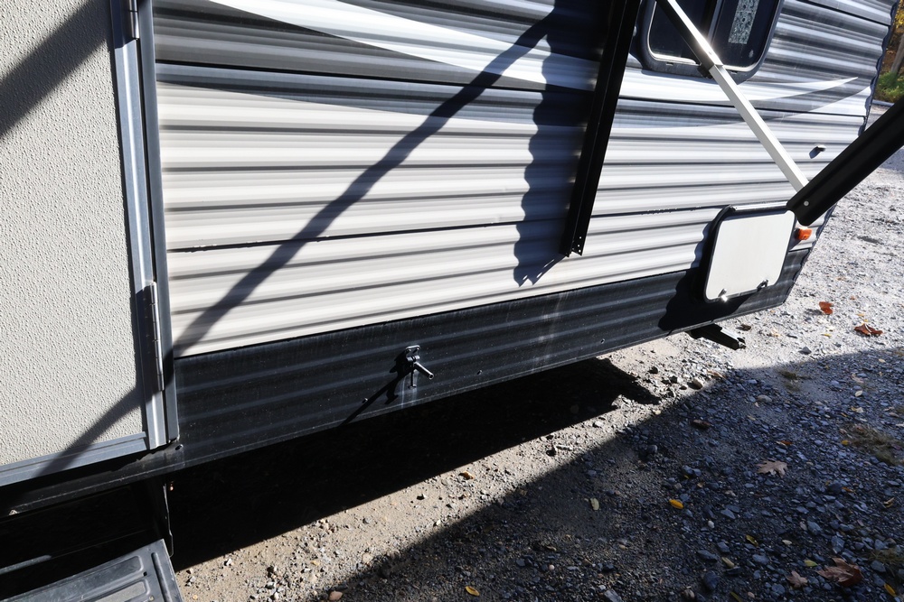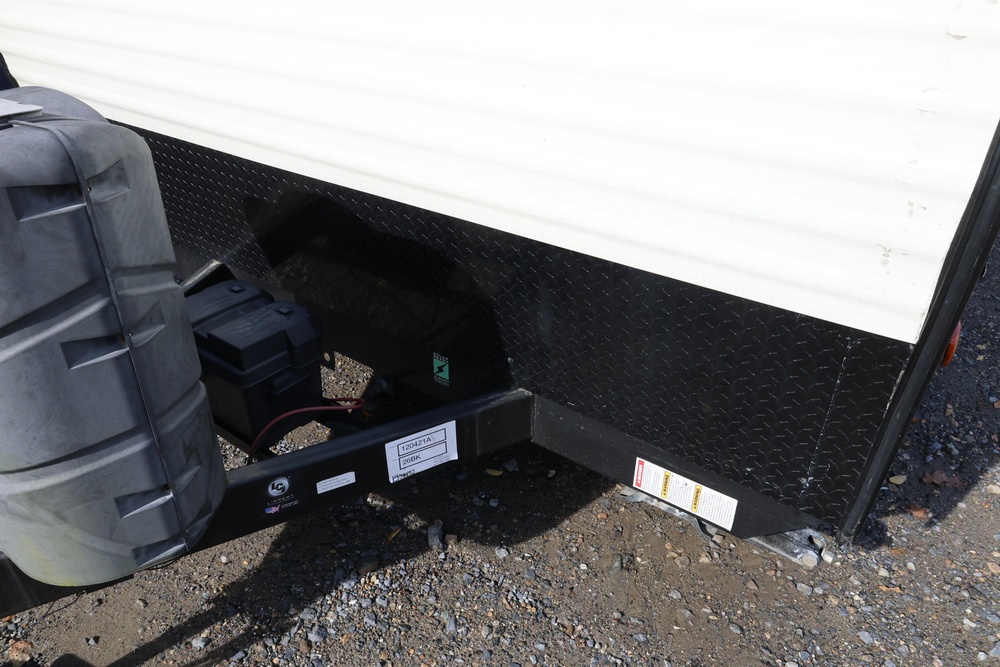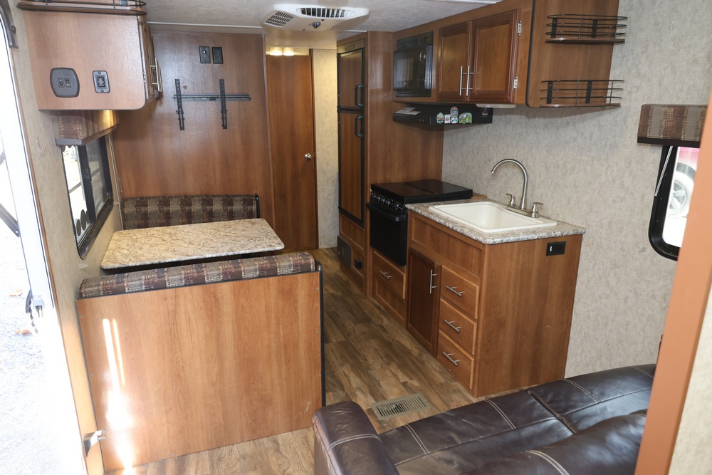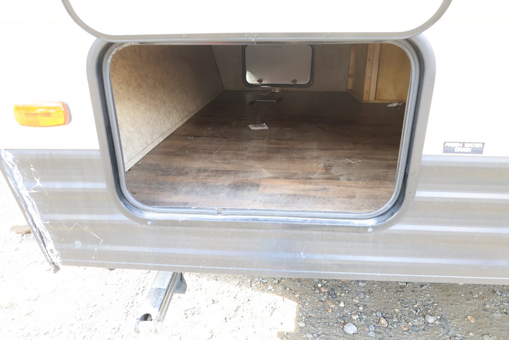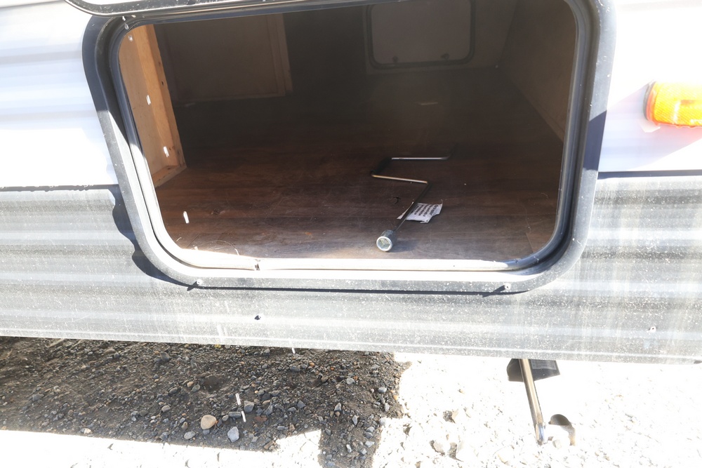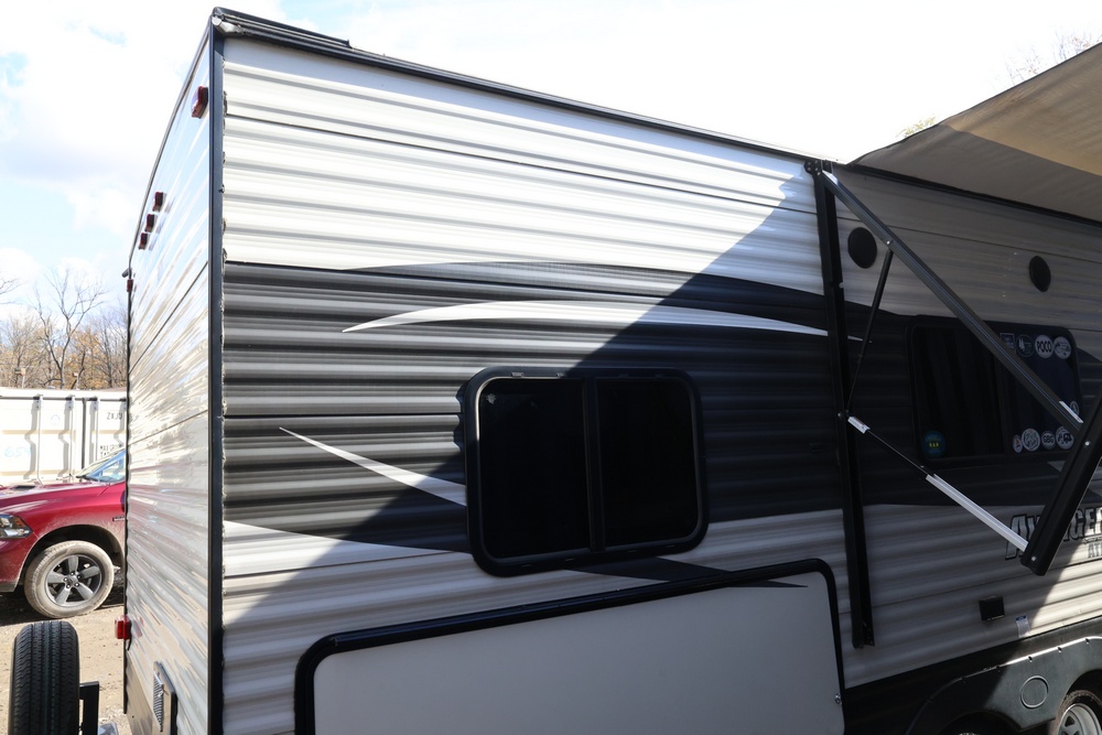 2018 Prime Time Avenger ATI 26BK travel trailer VIN: 5ZT2AVRB0JB917502 with a dry weight of 4,708 lbs and a GVWR of 7,474 lbs, offering a cargo capacity of 2,766 lbs. It features a front queen bed, rear bunk, a central kitchen and living area, and a full rear bathroom. The trailer includes an outdoor kitchen with a sink, mini fridge, and storage, as well as a spare tire and ST205/75R14C tires on 14x5.5 rims. It has a 2-5/16" coupler, a fresh water tank capacity of 158 kg, and a waste water tank capacity of 256 kg. The unit was manufactured by Forest River, Inc. on June 29, 2017. See photos of water leak in the front room. Title available. Title will transfer via dealer paperwork in Highland NY.
