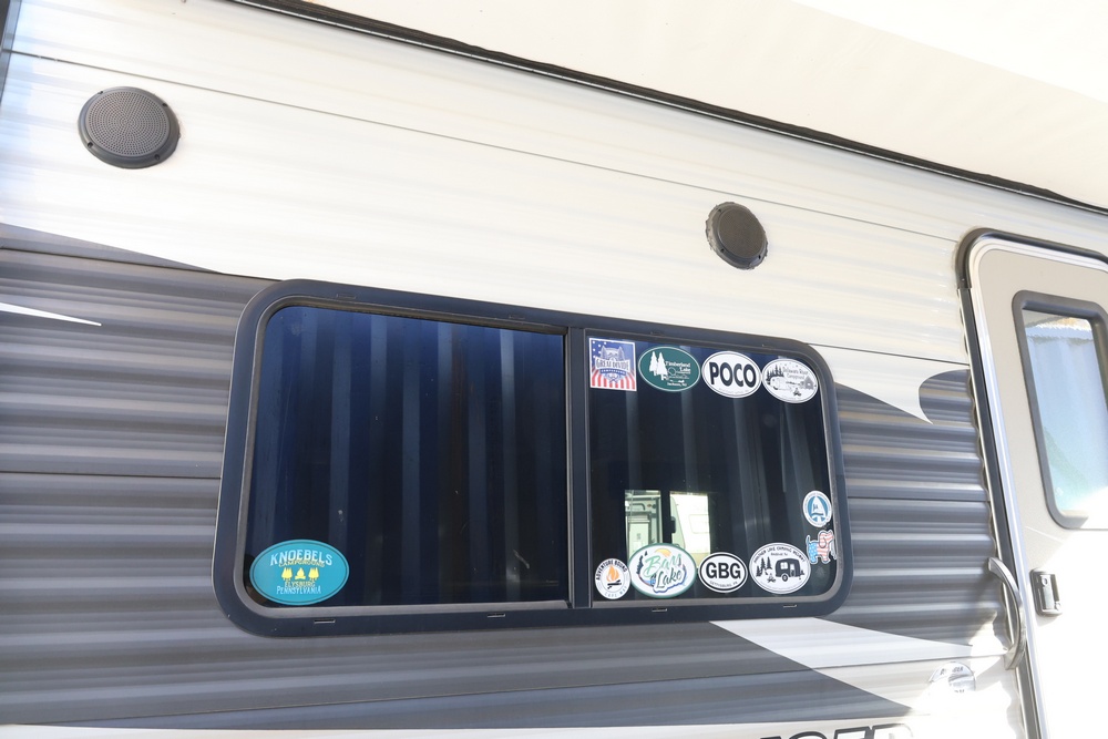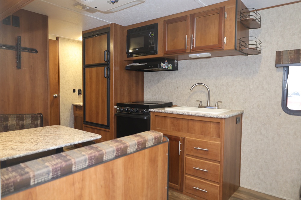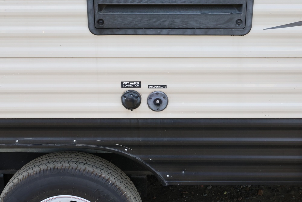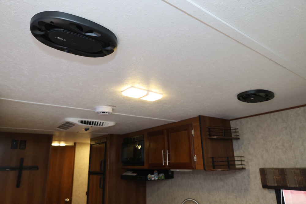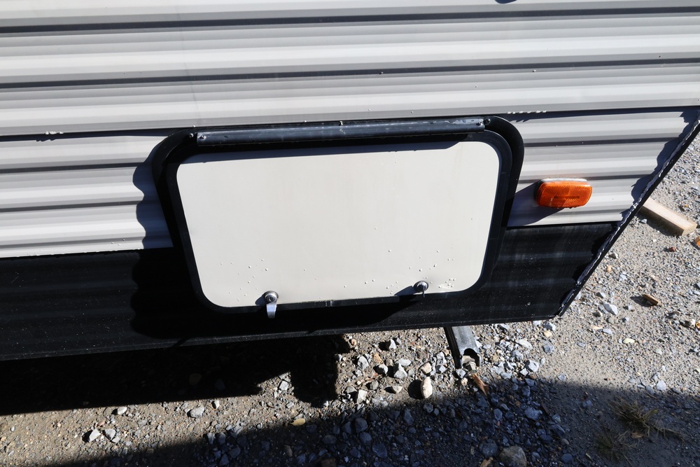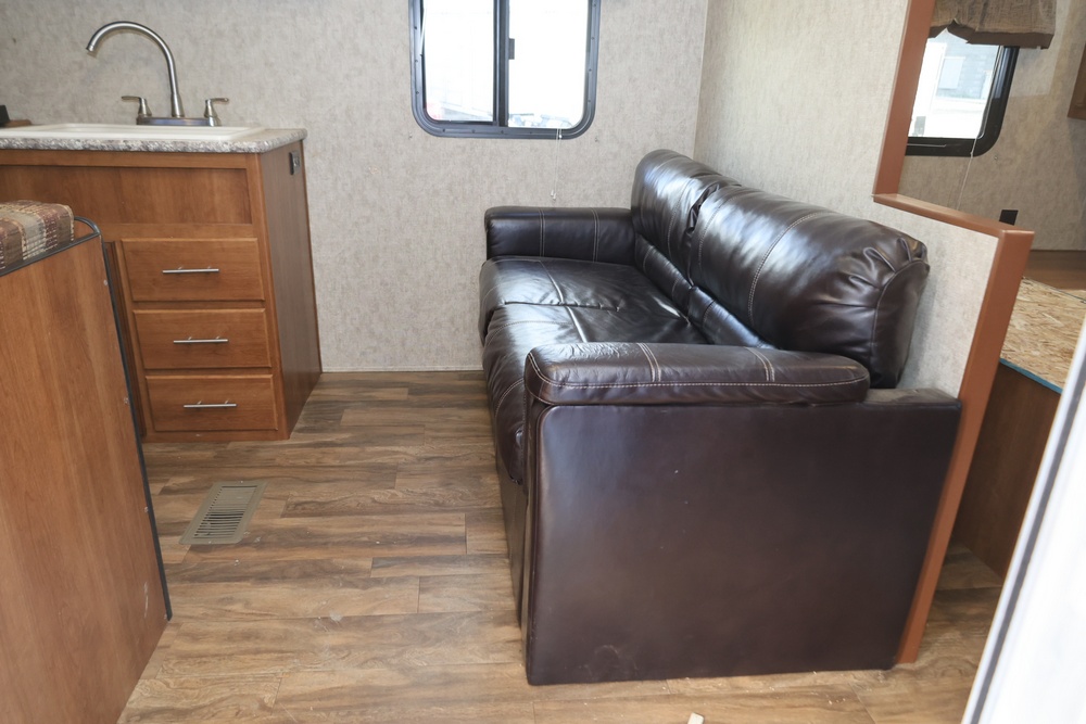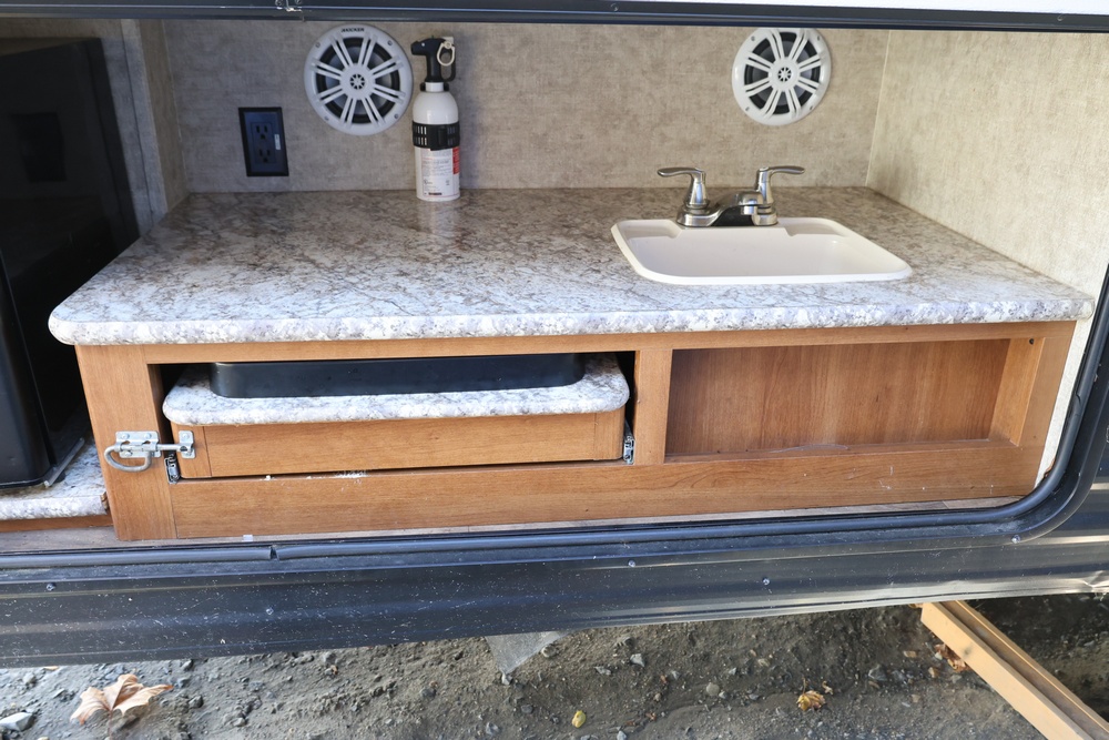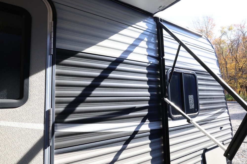 2018 Prime Time Avenger ATI 26BK travel trailer VIN: 5ZT2AVRB0JB917502 with a dry weight of 4,708 lbs and a GVWR of 7,474 lbs, offering a cargo capacity of 2,766 lbs. It features a front queen bed, rear bunk, a central kitchen and living area, and a full rear bathroom. The trailer includes an outdoor kitchen with a sink, mini fridge, and storage, as well as a spare tire and ST205/75R14C tires on 14x5.5 rims. It has a 2-5/16" coupler, a fresh water tank capacity of 158 kg, and a waste water tank capacity of 256 kg. The unit was manufactured by Forest River, Inc. on June 29, 2017. See photos of water leak in the front room. Title available. Title will transfer via dealer paperwork in Highland NY.