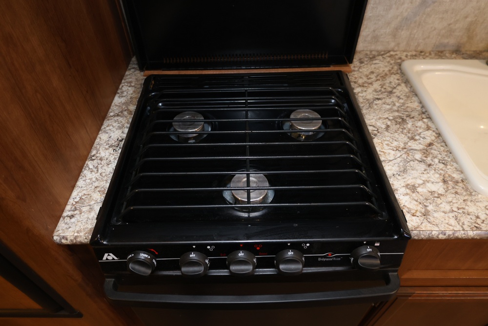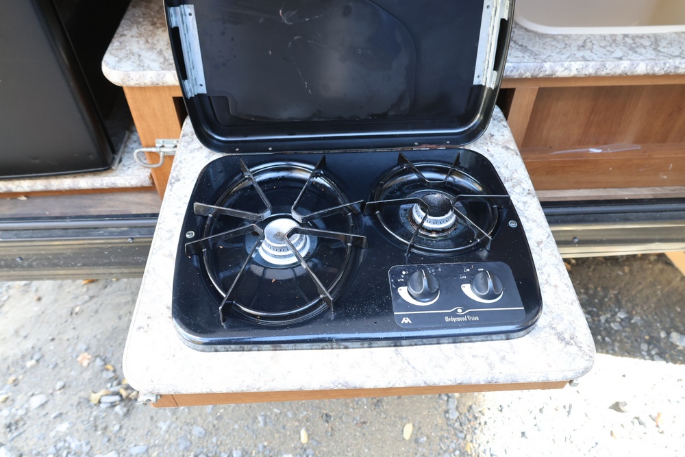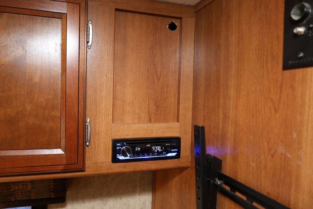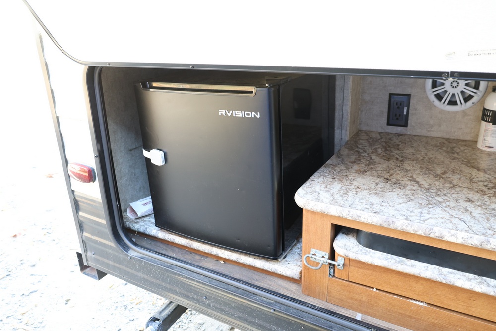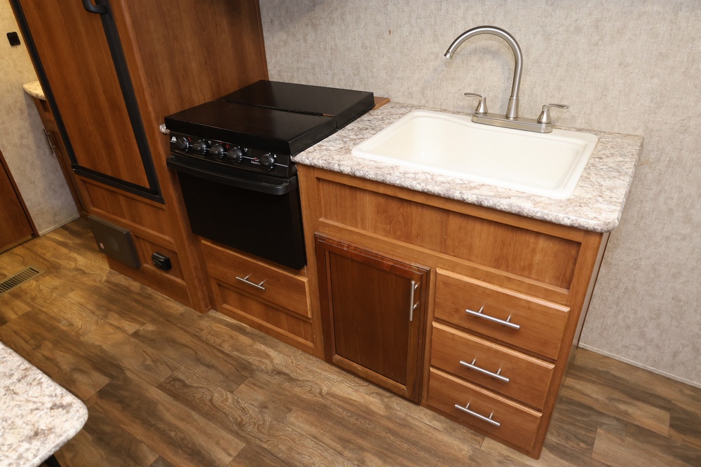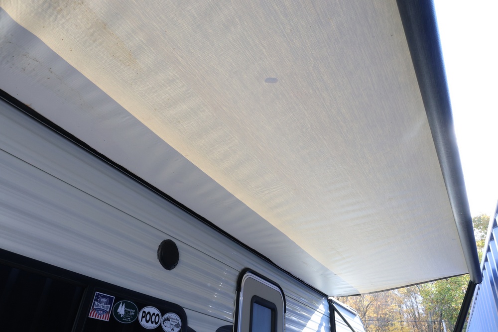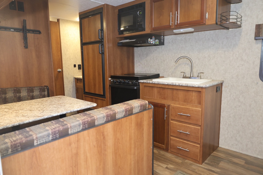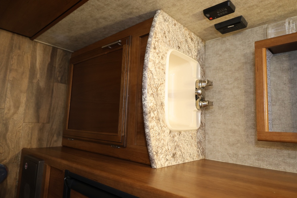 2018 Prime Time Avenger ATI 26BK travel trailer VIN: 5ZT2AVRB0JB917502 with a dry weight of 4,708 lbs and a GVWR of 7,474 lbs, offering a cargo capacity of 2,766 lbs. It features a front queen bed, rear bunk, a central kitchen and living area, and a full rear bathroom. The trailer includes an outdoor kitchen with a sink, mini fridge, and storage, as well as a spare tire and ST205/75R14C tires on 14x5.5 rims. It has a 2-5/16" coupler, a fresh water tank capacity of 158 kg, and a waste water tank capacity of 256 kg. The unit was manufactured by Forest River, Inc. on June 29, 2017. See photos of water leak in the front room. Title available. Title will transfer via dealer paperwork in Highland NY.
