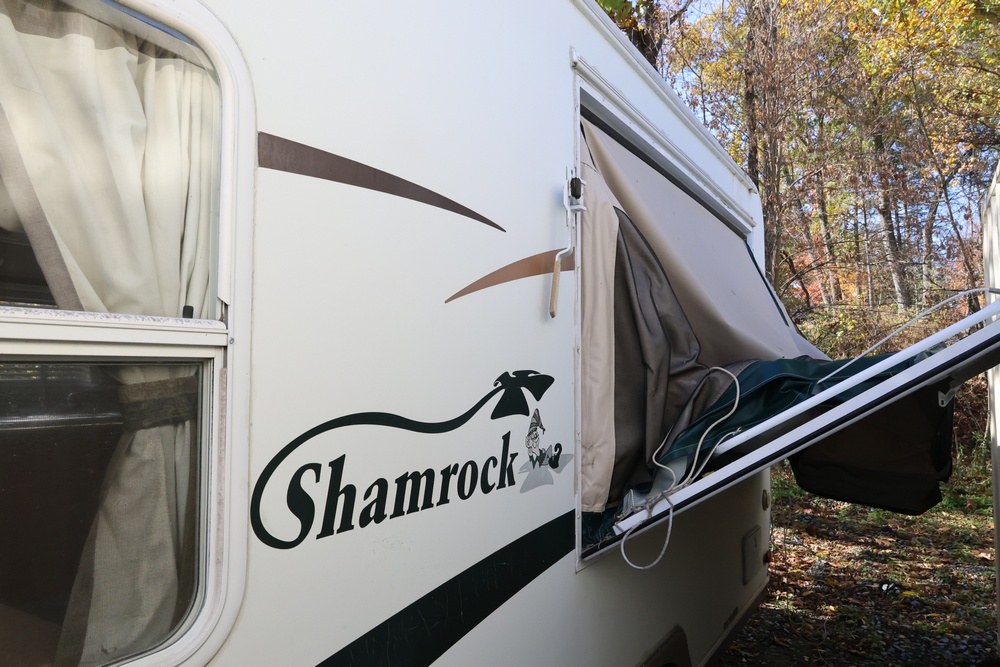 2007 Forest River Shamrock pop-out travel trailer VIN: 4X4TFLT267D095820. With a hybrid expandable design that includes canvas-covered pop-out sleeping areas on both ends and one side. The trailer features dual axles with white steel wheels, exterior graphics, a side awning, a three-burner gas stove, a dual basin kitchen sink, an overhead air conditioning unit, wood-paneled cabinetry, a dinette with upholstered seating, and a built-in Domestic refrigerator with matching wood paneling. Floor soft in areas. Title available Title will transfer via dealer paperwork in Highland NY.