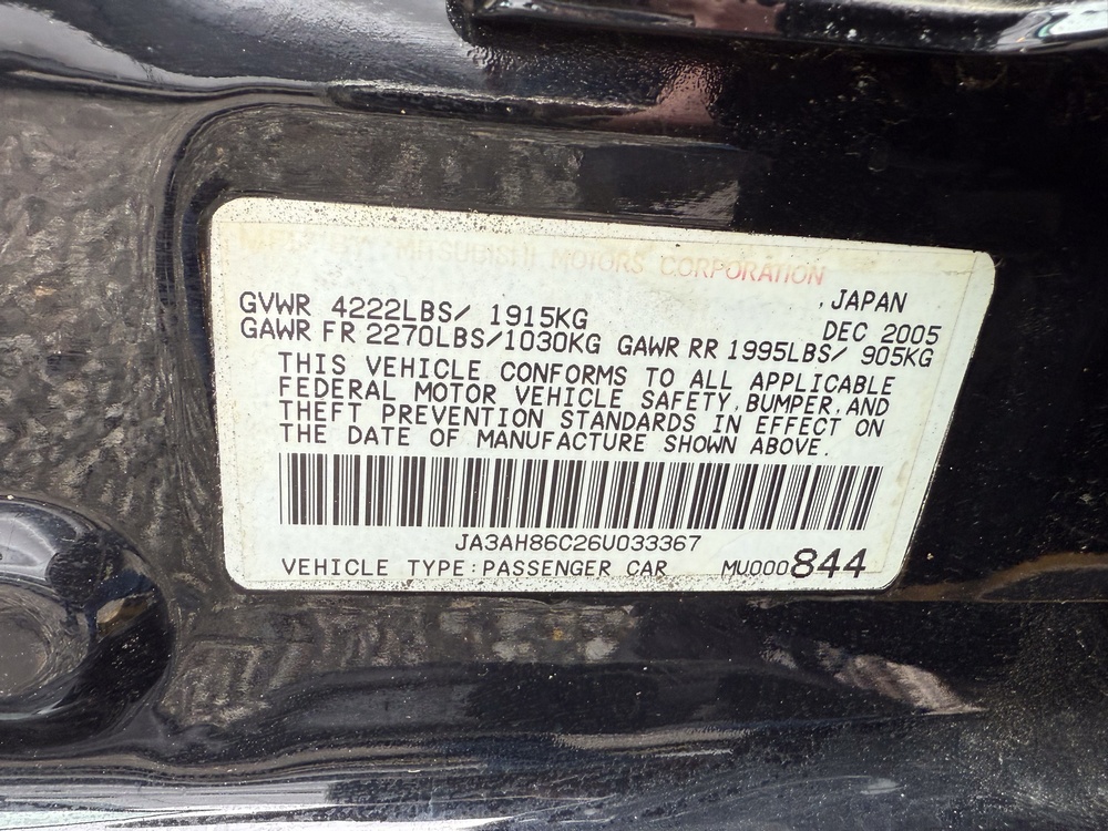 2006 Mitsubishi Lancer Evolution IX-MR with a 2.0L L4 DOHC 16V TURBO engine, and manual transmission. VIN: JA3AH86C26U033367. Odometer reading 97,566. Seller reports: title reads 99,999 due to an error when retitling the vehicle. Does not have A/C. Runs and drives. These vehicles are being transferred through NJ Dealer paperwork.
