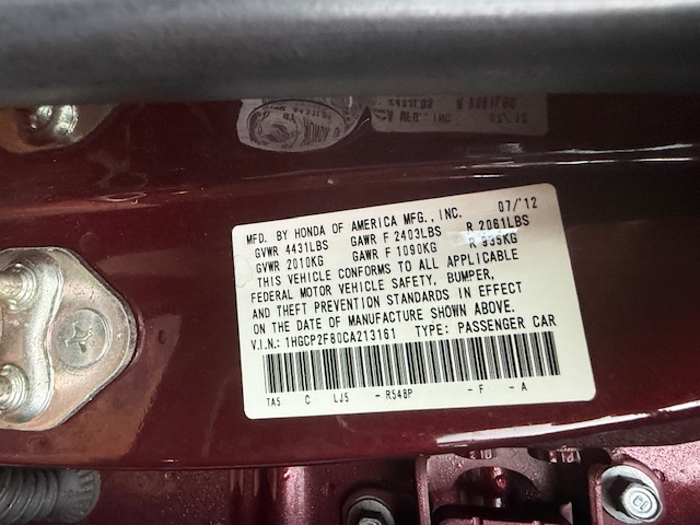 2012 Honda Accord with a 2.4L L4 DOHC 16V engine. VIN: 1HGCP2F80CA213161. Odometer reading: 154025. Seller reports: Runs and drives. These vehicles are being transferred through NJ Dealer paperwork.